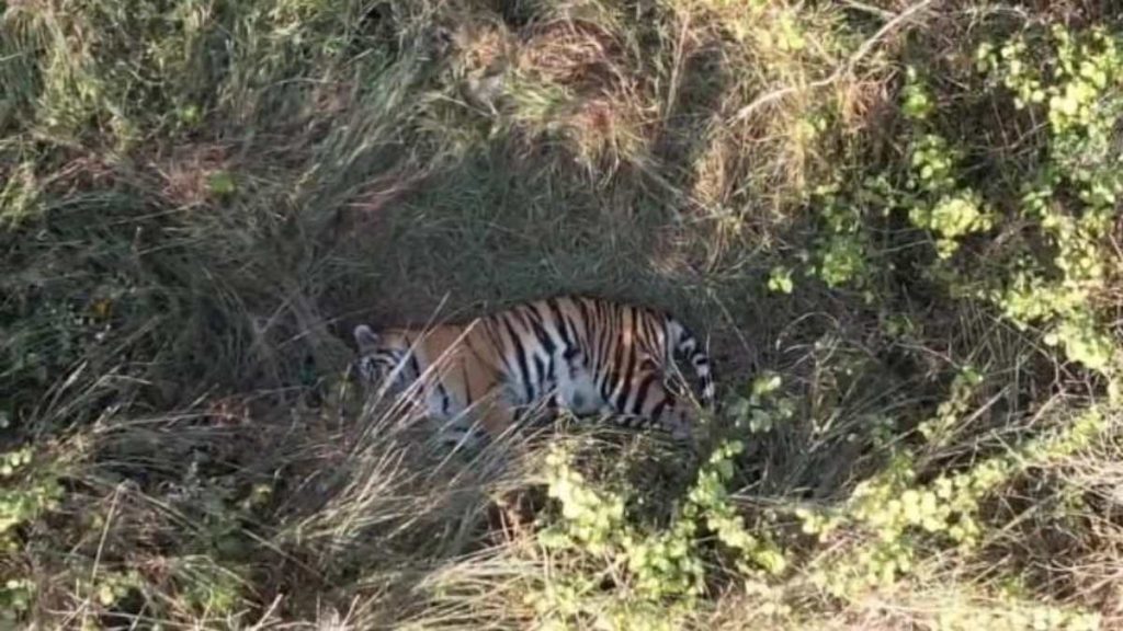 गौरव जैन, गौरेला-पेण्ड्रा-मरवाही. जिले में भालू लैंड के नाम से मशहूर मरवाही के जंगल बीते दो दिनों से मादा बाघ की दहाड़ से गूंज रहा है. मरवाही वनमंडल के परासी गांव में बीते दिन इस बाघ को किसान के बैंगन की फसलों के बीच देखा गया था, जिसकी सूचना के बाद वन मंडल लगातार बाघ पर नजर रख रहा है. आज बाघ की ड्रोन से तस्वीर ली गयी है. जिसमें साफ देखा जा सकता है कि मादा बाघ जंगलो में आराम कर रही है. वहीं आवासीय क्षेत्र में बाघ की धमक से ग्रामीणों मे दहशत का माहौल बना हुआ है.