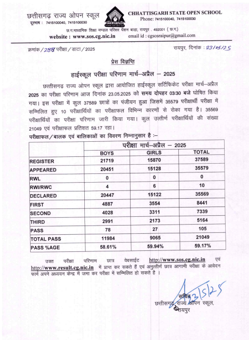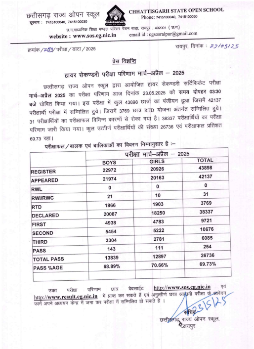 सत्यपाल राजपूत, रायपुर। छत्तीसगढ़ राज्य ओपन स्कूल द्वारा आयोजित हाई स्कूल और हायर सेकेण्डरी परीक्षा 2025 (CG Open School 10th-12th) का परिणाम आधिकारिक रूप से घोषित कर दिया गया है. राज्य ओपन स्कूल के सचिव ने आज परिणाम जारी करते हुए बताया कि इस बार 10वीं का परीक्षा परिणाम 59.17 प्रतिशत और 12वीं का परीक्षा परिणाम 69.73 प्रतिशत रहा.