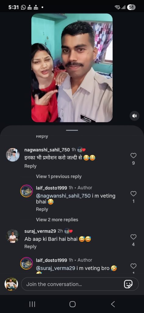 हाल ही में मस्तूरी थाने में पदस्थ एक आरक्षक का वीडियो सोशल मीडिया में वायरल हुआ था. जिसमें उसने वर्दी पहनकर अपनी पत्नी के साथ हाय रानी, हेलो रानी गाने के साथ रील बनाई थी. वीडियो वायरल होने पर आरक्षक को निलंबित कर दिया गया था. इस कार्रवाई के बाद अब एक और आरक्षक का पत्नी के साथ वर्दी पहने इंस्टा रील ट्रेंड कर रहा है. इस पर लोग तरह-तरह के कमेंट कर रहे हैं. कुछ ने तो उन्हें वर्दी पहने होने पर वीडियो हटाने की सलाह दे रहे हैं. कुछ वीडियो को बढ़िया बता रहे हैं. एक तो कुछ लिख रहे कि अब लाइन जाने की बारी आप की है. वहीं suraj_verma29 ने कमेंट में लिखा है कि अब आपकी बारी है. इस पर जवान ने उसे टैग करते हुए लिखा कि…आई एम वेटिंग ब्रो. बता दें इंस्टा में जवान का एक दो नहीं बल्कि आधा दर्जन से ज्यादा वीडियो वायरल हो रहा है.