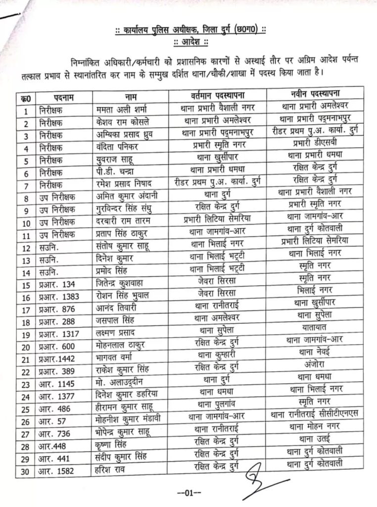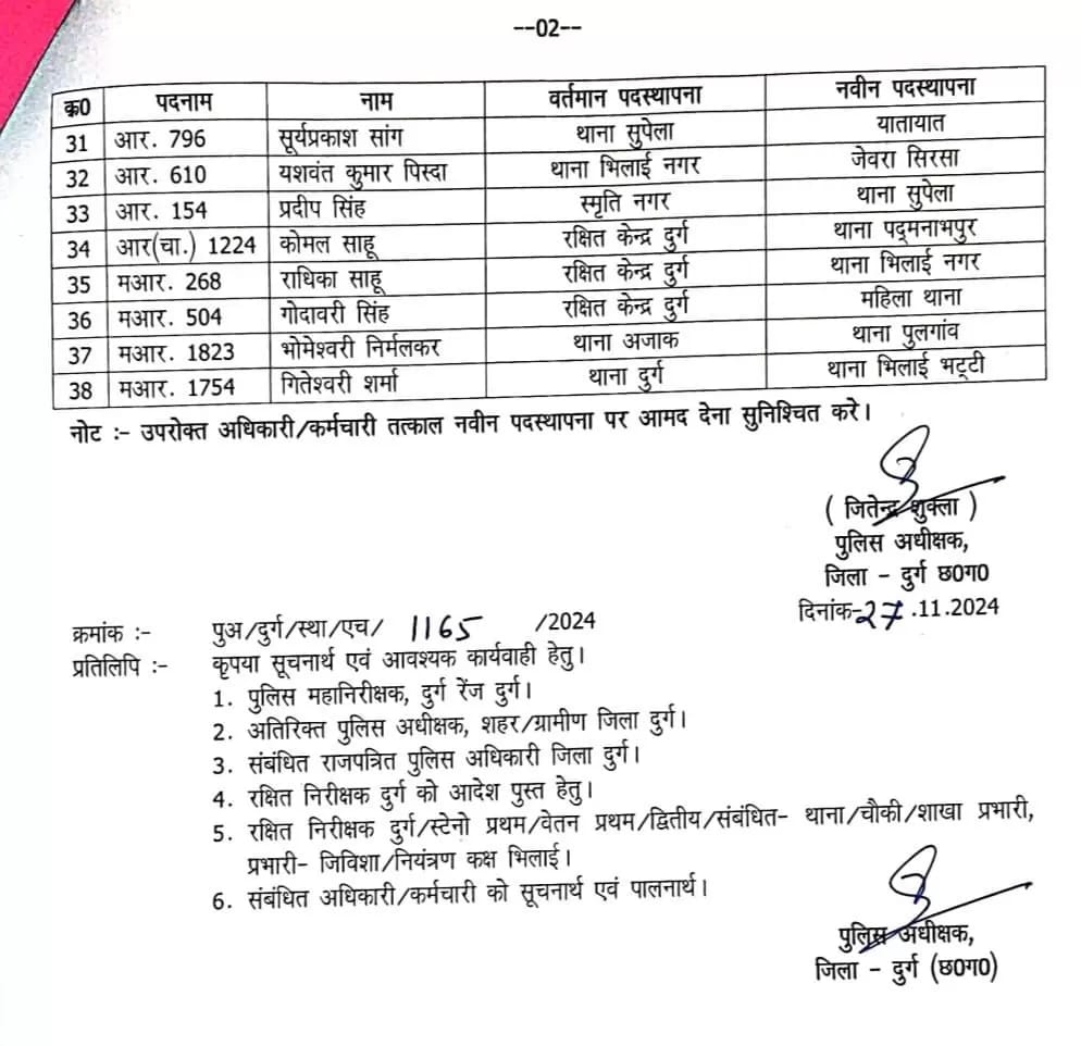 CG Police Transfer: दुर्ग। दुर्ग पुलिस विभाग में बड़ा फेरबदल (Police Transfer) हुआ है, जिसमें SI, ASI, हेड कांस्टेबल समेत 38 पुलिसकर्मियों को एक जगह से दूसरी जगह भेजा गया है. यह ट्रांसफर लिस्ट एसपी जितेंद्र शुक्ला ने ट्रांसफर जारी किया है.