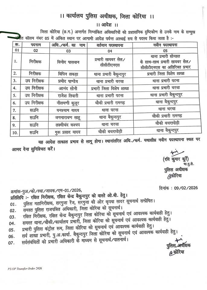 CG Police Transfer : कोरिया. छत्तीसगढ़ के कोरिया जिले के पुलिस विभाग में तबादला एक्प्रेस दौड़ी है. बड़े पैमाने पर पुलिस अधिकारी-कर्मचारी का ट्रांसफर हुआ है. प्रशासनिक कसावट के उद्देश्य से 2 निरीक्षक, 4-4 एसआई और एएसआई समेत 69 पुलिसकर्मियों का पुलिस अधीक्षक रवि कुमार कुर्रे ने आदेश जारी किया है. जारी आदेश में पुलिसकर्मियों को नविन पदस्थापना दी गई है.