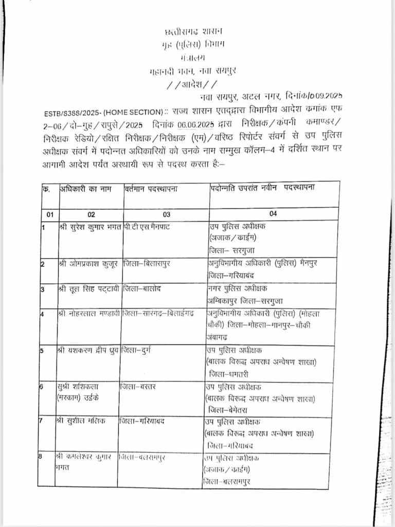 इस आदेश में हाल ही में निरीक्षक से डीएसपी पद पर पदोन्नत हुए पुलिस अफसरों को नवीन पदस्थापना दी गई है। रमाकांत साहू को रायपुर सिविल लाइन सीएसपी बनाए गए हैं।