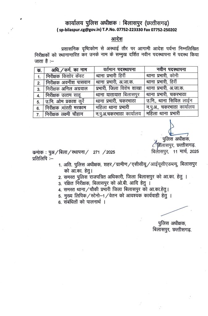 बिलासपुर. कानून व्यवस्था पर कसावट लाने जिले के 7 थाना प्रभारियों का तबादला किया गया है. इसका आदेश एसपी रजनेश सिंह ने जारी किया. कोनी थाना प्रभारी नवीन देवांगन को सस्पेंड किए जाने के बाद थाना प्रभारियों का ट्रांसफर किया गया है.