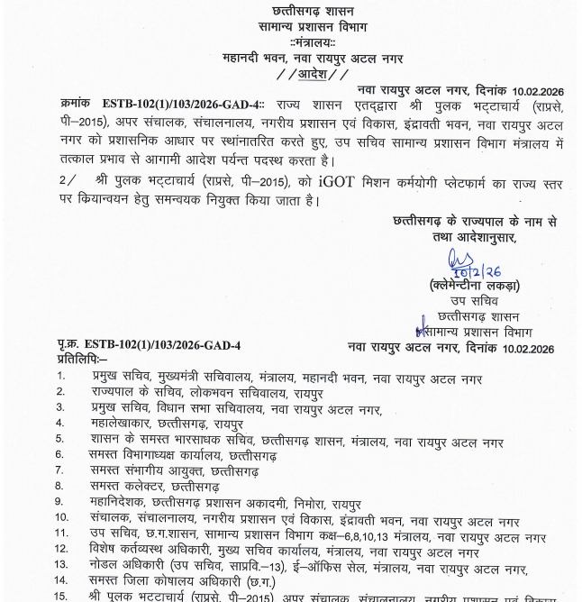 रायपुर। छत्तीसगढ़ शासन ने प्रशासनिक फेरबदल करते हुए राज्य प्रशासनिक सेवा के अधिकारी पुलक भट्टाचार्य को सामान्य प्रशासन विभाग मंत्रालय में उप सचिव के पद पर तत्काल प्रभाव से नियुक्त किया है। इसके साथ ही उन्हें iGOT मिशन कर्मयोगी प्लेटफॉर्म के राज्य स्तरीय क्रियान्वयन का समन्वयक भी बनाया गया है। यह आदेश सामान्य प्रशासन विभाग ने जारी किया है।