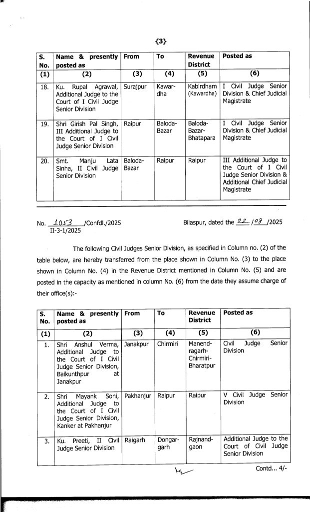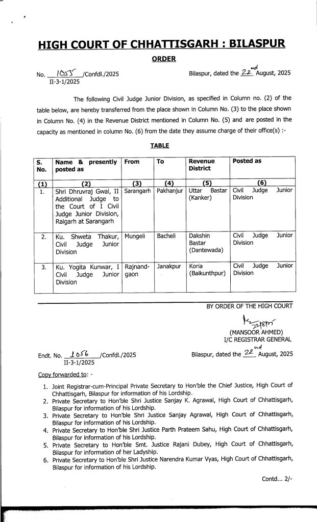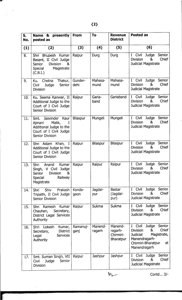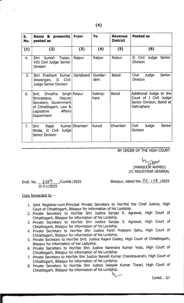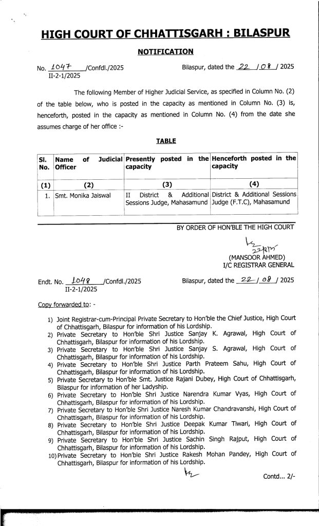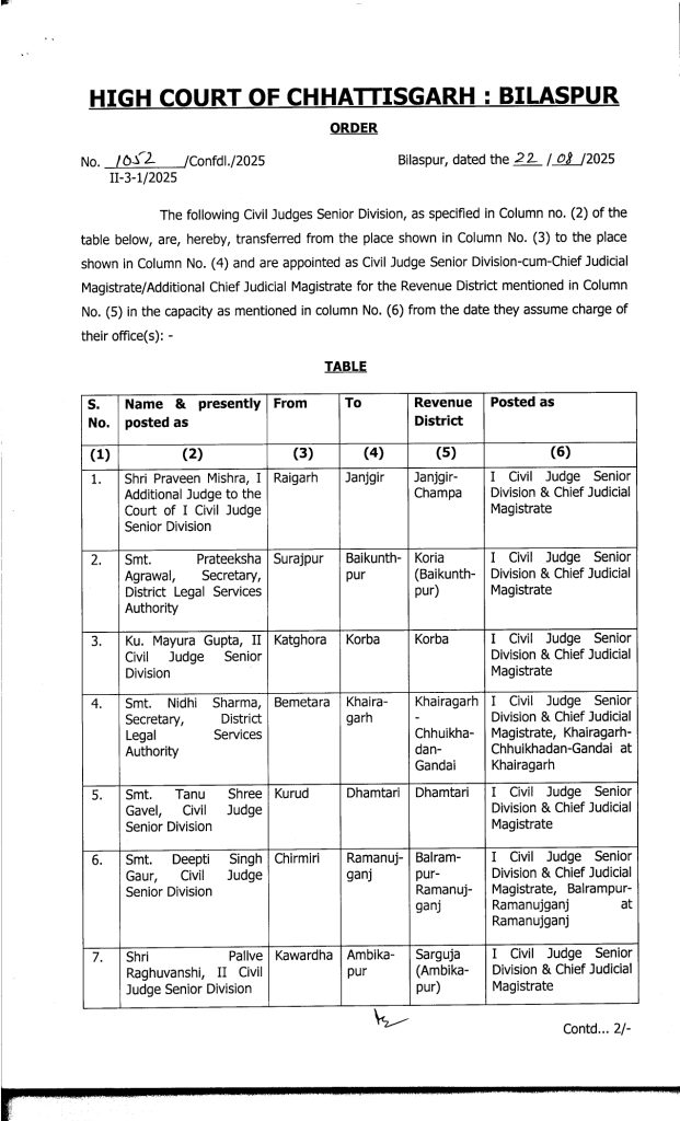 CG Promotion Breaking : वीरेन्द्र गहवई, बिलासपुर. बड़े पैमाने पर जजों का प्रमोशन किया गया है. इसके साथ ही उनकी नई पदस्थापना भी कर दी गई है. जारी लिस्ट के मुताबिक 19 मुख्य न्यायिक मजिस्ट्रेटों को अतिरिक्त जिला एवं सत्र न्यायाधीश (एडीजे) के पद पर प्रमोट किया गया है. इसके अलावा 20 जूनियर मजिस्ट्रेट को मुख्य न्यायिक मजिस्ट्रेट के पद पर पदोन्नति दी गई है. इस संबंध में हाईकोर्ट रजिस्ट्रार जनरल ने आदेश जारी किया है.