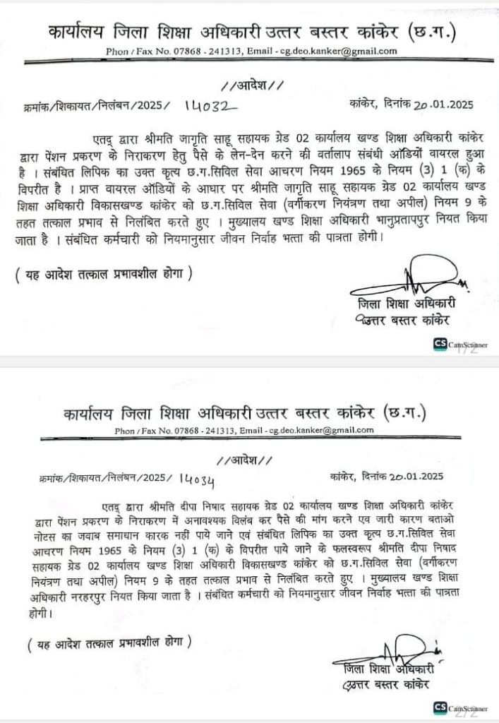 खण्ड शिक्षा अधिकारी कार्यालय कांकेर में पदस्थ जागृति और दीपा के पैसों के लेनदेन की बातचीत का ऑडियो बीते दिनों वायरल हुआ था. जिसके बाद दोनों के खिलाफ कार्रवाई करते हुए शो कॉज नोटिस जारी किया गया था. इसका कोई जवाब प्रस्तुत नहीं करने पर उक्त कृत्य को छत्तीसगढ़ सिविल सेवा आचरण नियम 1965 के नियम (3) 1 (क) के विपरीत पाया गया.