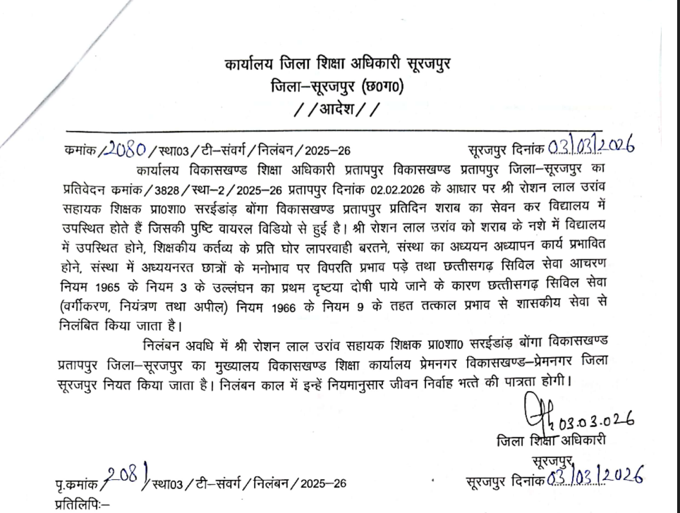निलंबन अवधि के दौरान सहायक शिक्षक रोशन लाल उरांव का मुख्यालय विकासखंड शिक्षा कार्यालय, प्रेमनगर (विकासखंड-प्रेमनगर, जिला सूरजपुर) निर्धारित किया गया है। इस दौरान उन्हें नियमानुसार जीवन-निर्वाह भत्ता देय होगा.
