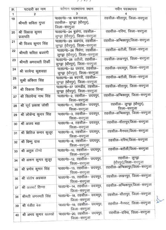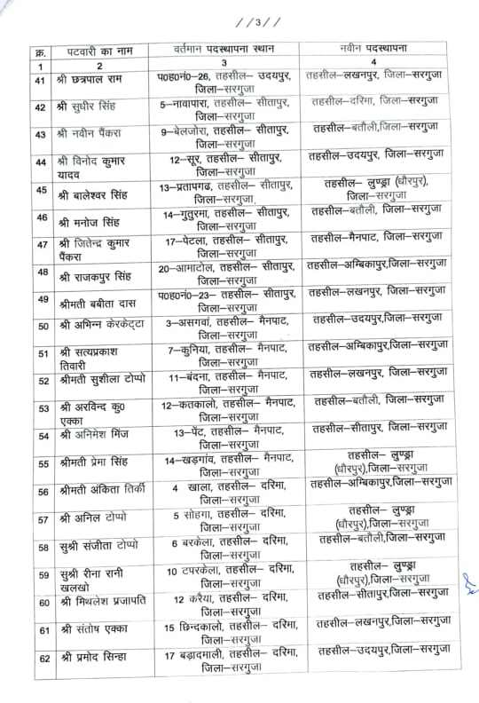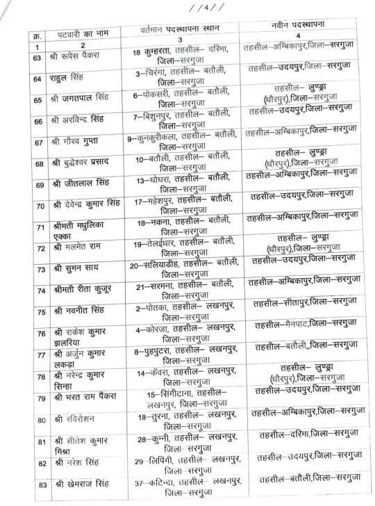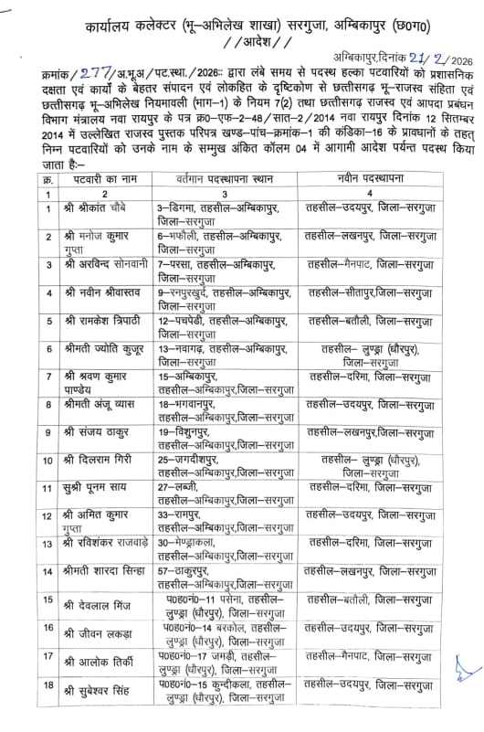 अंबिकापुर। जिले में बड़े पैमाने पर पटवारियों का तबादला किया गया है। लंबे समय से एक ही स्थान पर जमे 83 पटवारियों को इधर से उधर किया गया है। इस संबंध में कलेक्टर अजित वसंत ने आदेश जारी करते हुए शहर क्षेत्र में लंबे समय से पदस्थ पटवारियों को ग्रामीण क्षेत्रों में जिम्मेदारी सौंपी है। इस तबादला सूची को प्रशासनिक व्यवस्था को मजबूत करने और राजस्व कार्यों में पारदर्शिता लाने के उद्देश्य से जारी किया गया है।