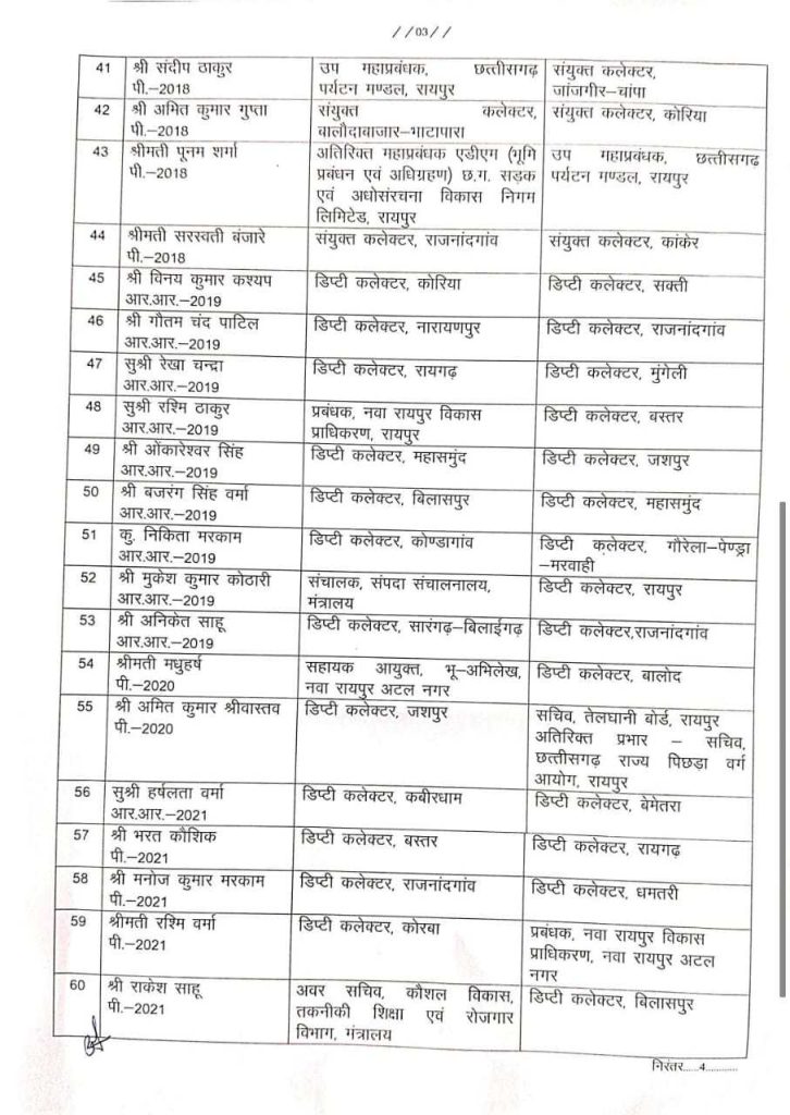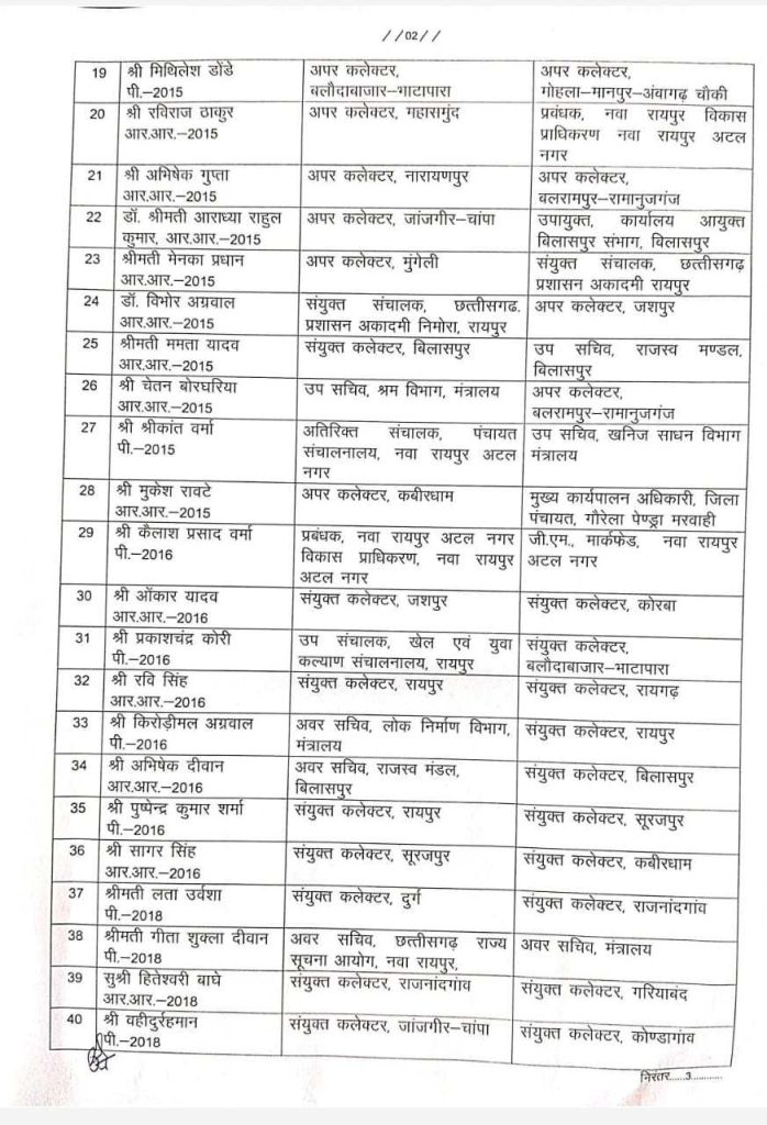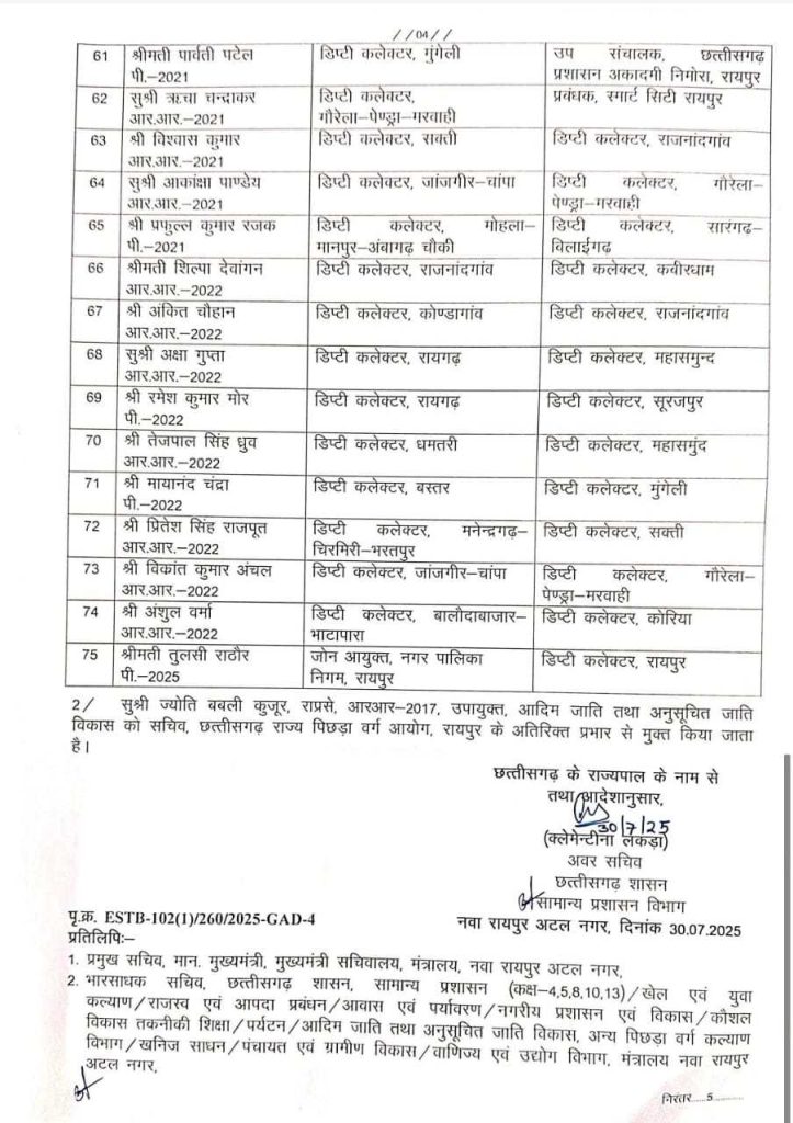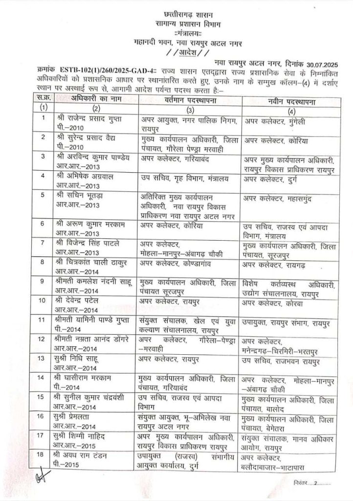 रायपुर. छत्तीसगढ़ सरकार ने राज्य प्रशासनिक सेवा के 75 अधिकारियों का तबादला किया है. कई जिलों के अपर कलेक्टर, संयुक्त कलेक्टर, डिप्टी कलेक्टर, मुख्य कार्यपालन अधिकारी बदले गए हैं. इसका आदेश आज सामान्य प्रशासन विभाग ने जारी किया है.