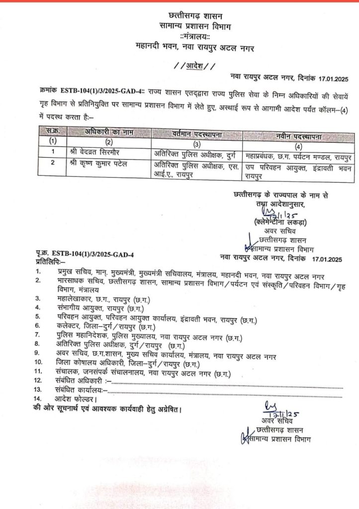 रायपुर. राज्य पुलिस सेवा के 2 अधिकारियों को प्रतिनियुक्ति पर लेते हुए सामान्य प्रशासन विभाग ने बड़ी जिम्मेदारी सौंपी है. एडिशनल एसपी दुर्ग वेदव्रत सिरमौर को पर्यटन मंडल का महाप्रबंधक बनाया गया है. वहीं अतिरिक्त पुलिस अधीक्षक कृष्ण कुमार पटेल को उप परिवहन आयुक्त बनाया गया है.
