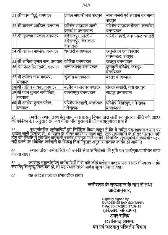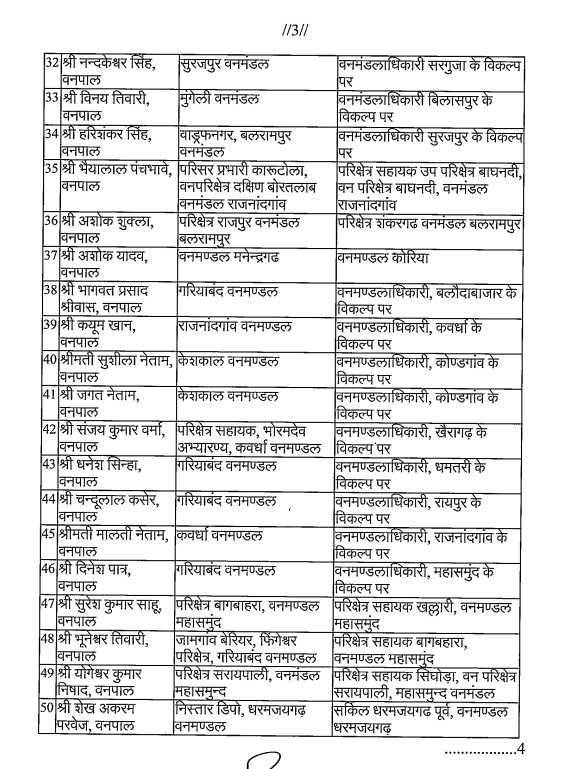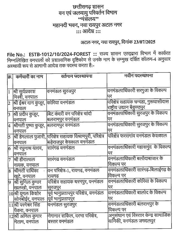 रायपुर. राज्य सरकार ने वन विभाग में बड़े पैमाने पर तबादला किया है. 50 वनपालों को इधर से उधर किया गया है.