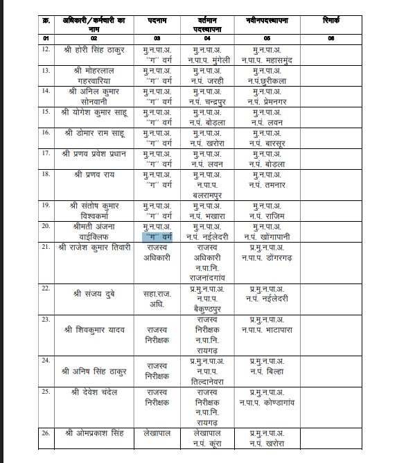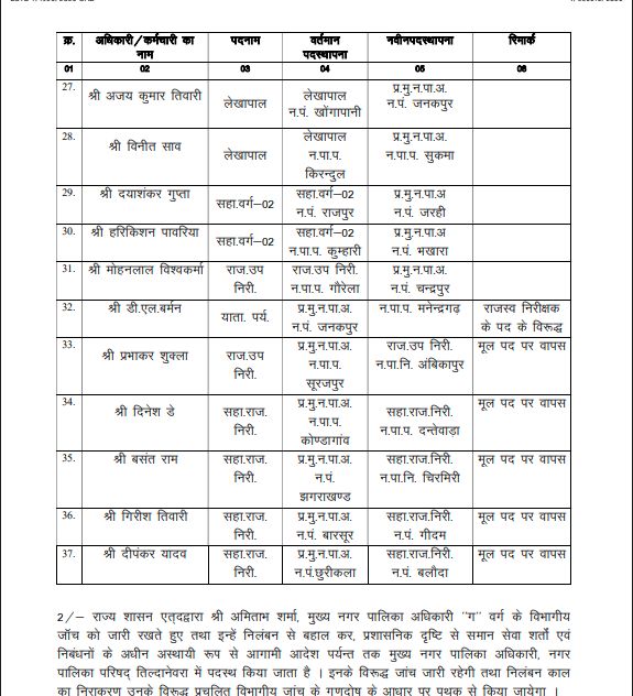 नगरीय प्रशासन एवं विकास विभाग की ओर से जारी आदेश के अनुसार प्रशासनिक चुस्ती बढ़ाने के उद्देश्य से महत्वपूर्ण नगर पालिकाओं एवं जिला मुख्यालयों में नियमित मुख्य नगर पालिका अधिकारियों की पदस्थापना की गई है। वहीं 6 सहायक राजस्व अधिकारियों एवं जूनियर कर्मचारियों, जो प्रभारी मुख्य नगर पालिका अधिकारी के रूप में पदस्थ थे, उन्हें उनके मूल पद पर वापस भेजा गया है।