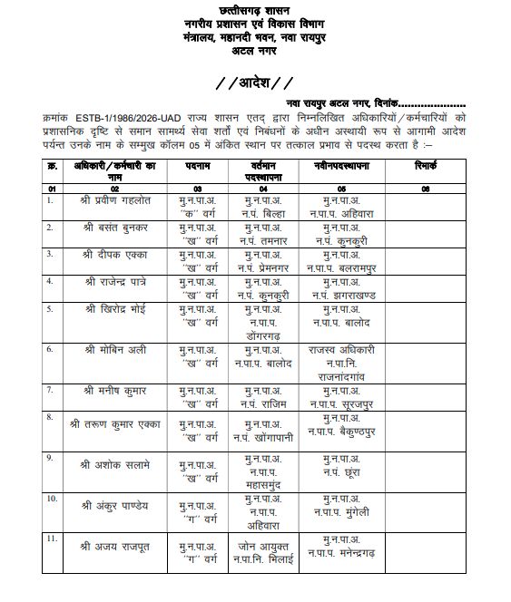 CG Transfer News : रायपुर। छत्तीसगढ़ शासन के नगरीय प्रशासन एवं विकास विभाग ने बड़ा प्रशासनिक फेरबदल करते हुए कुल 37 अधिकारियों और कर्मचारियों का तबादला किया है। इस संबंध में आदेश भी जारी किया गया है।