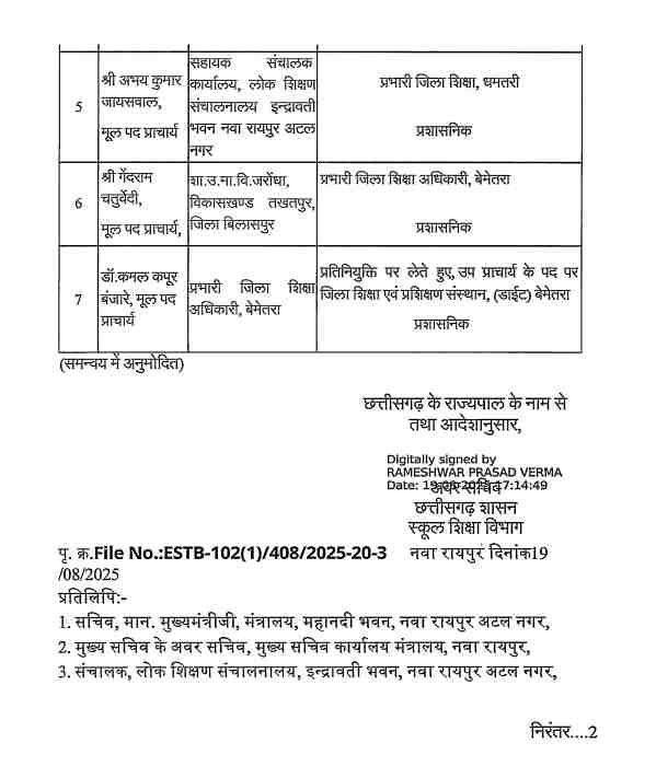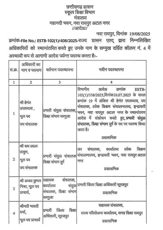 रूपलाल ठाकुर को उप संचालक लोकशिक्षण संचालनालय के पद पर पदस्थ किया गया है. वहीं अजय कुमार मिश्रा मूल पद प्राचार्य को सूरजपुर के प्रभारी जिला शिक्षा अधिकारी बनाए गए हैं. प्राचार्य गेंदराम चतुर्वेदी को प्रभारी जिला शिक्षा अधिकारी बेमेतरा के पद पर पदस्थ किया गया है.