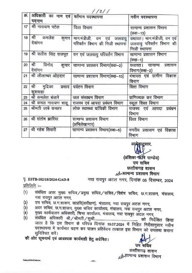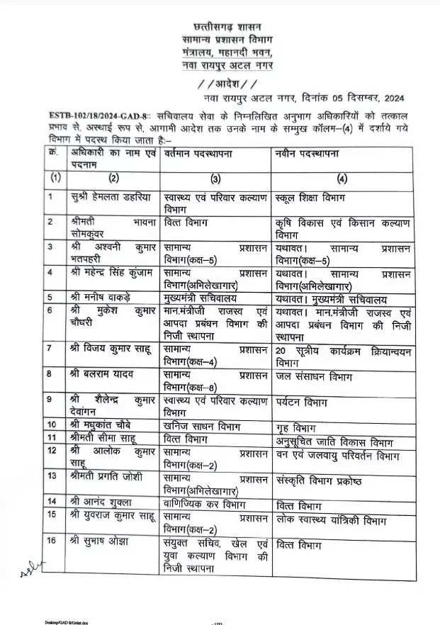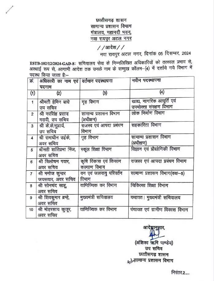 रायपुर। छत्तीसगढ़ सरकार ने मंत्रालय के 27 उप सचिव से लेकर अनुभाग अधिकारियों का तबादला किया है. 6 साल से अधिक समय से अधीक्षण शाखा में एसओ, अवर सचिव रहे एनएस मरावी अब लोक निर्माण विभाग में उप सचिव होंगे. इसका आदशे आज सामान्य प्रशासन विभाग छग शासन ने जारी किया है.