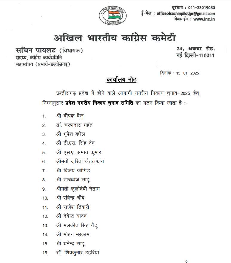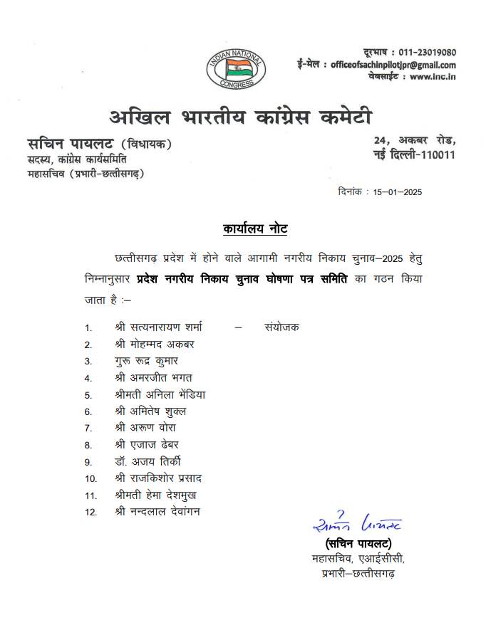 रायपुर। छत्तीसगढ़ में आगामी नगरीय निकाय चुनाव 2025 की तैयारियों को लेकर कांग्रेस पार्टी ने अपनी चुनाव समिति और घोषणा-पत्र समिति का गठन किया है. इस संबंध में आदेश छत्तीसगढ़ कांग्रेस प्रभारी सचिन पायलट ने जारी किया है.