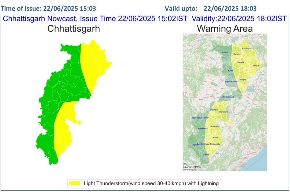 मौसम विभाग ने सुकमा, बीजापुर, दंतेवाड़ा, बस्तर, नारायणपुर, कोंडागावं , कांकेर, धमतरी, गरियाबंद, महासमुंद , जांजगीर-चांपा, रायगढ़, कोरबा, जशपुर, सरगुजा, सूरजपुर, कोरिया, बलरामपुर के लिए बारिश का अलर्ट जारी किया है. इन सभी जिलों में गरज-चमक और तेज हवा के साथ बारिश की संभावना है.