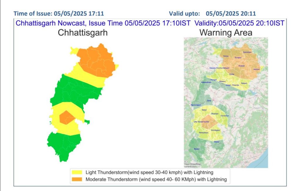 मौसम विभाग के अनुसार नारायणपुर, कोंडागांव, उत्तर बस्तर कांकेर, धमतरी, बालोद, रायगढ़, कोरबा, जशपुर, गौरेला-पेंड्रा मरवाही, सुरगुजा, सूरजपुर, कोरिया, बलरामपुर जिलों में 40 से 60 किलोमीटर प्रति घंटे की रफ्तार से तेज हवाएं चलने, मेघगर्जन, आकाशीय बिजली गिरने और आंधी आने की चेतावनी दी गई है.