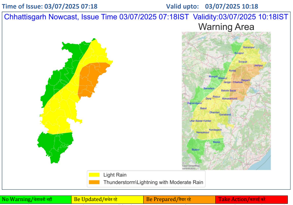 CG Weather: रायपुर। छत्तीसगढ़ में मानसून पूरी तरह सक्रिय हो गया है और लगातार कई जिलों में बारिश हो रही है. राजधानी रायपुर समेत कई जिलों में आज सुबह से हल्की बारिश हो रही है. मौसम विभाग ने अगले तीन घंटों के लिए प्रदेश के कई इलाकों में बारिश को लेकर चेतावनी जारी की है.