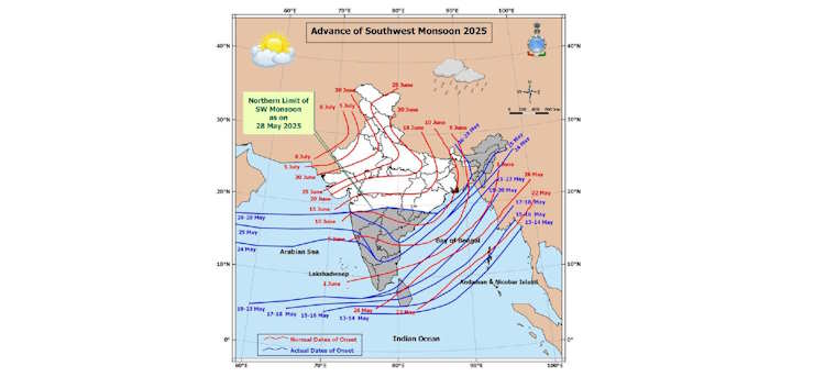 दक्षिण-पश्चिम मानसून 28 मई 2025 को छत्तीसगढ़ के कुछ हिस्सों में आगे बढ़ गया है. ओडिशा तट से दूर बंगाल की खाड़ी के उत्तर-पश्चिमी भाग पर कम दबाव का क्षेत्र बना हुआ है. इससे जुड़ा चक्रवाती परिसंचरण समुद्र तल से 7.6 किमी ऊपर तक फैला हुआ है, जो ऊंचाई के साथ दक्षिण की ओर झुका हुआ है. अगले 24 घंटों के दौरान इसके धीरे-धीरे उत्तर की ओर बढ़ने और बंगाल की खाड़ी के उत्तरी भाग पर डिप्रेशन में बदलने की संभावना है.