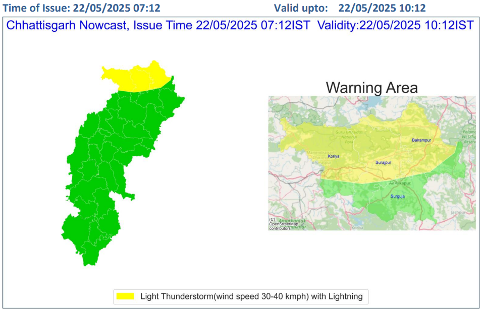 मौसम विभाग के अनुसार, सूरजपुर, कोरिया और बलरामपुर में सुबह 10:30 तक अचानक तेज हवा और गरज-चमक के साथ बारिश हो सकती है. इन तीनों जिलों में बारिश का यलो अलर्ट जारी किया गया है. इसके साथ ही सरगुजा जिले के कई हिस्सों में भी बारिश की संभावना है. सरगुजा संभाग में मौसम विभाग ने 30-40 KMPH की स्पीट से हवा चलने की संभावना जताई है.