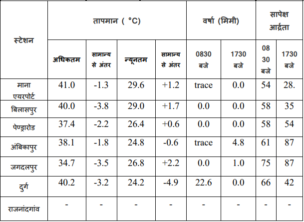 बीते दिन प्रदेश में सबसे अधिक तापमान राजधानी रायपुर में 41.4°C दर्ज किया गया. वहीं सबसे कम न्यूनतम तापमान 24.2°C दुर्ग में दर्ज किया गया.