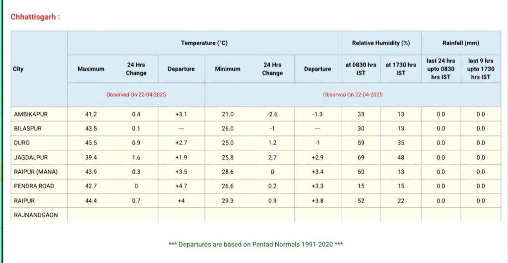 मौसम विभाग के अनुसार, रायपुर में तापमान 44.4 डिग्री सेल्सियस दर्ज किया गया, जो कि पिछले 10 वर्षों में सबसे अधिक है. बिलासपुर, दुर्ग और अन्य प्रमुख शहरों में भी तापमान 43 डिग्री के आसपास दर्ज किया गया है.