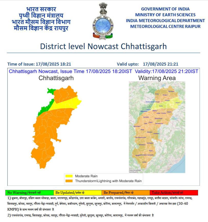 मौसम विभाग के अलर्ट के अनुसार अगले कुछ घंटों के दौरान सुकमा, बीजापुर, दंतेवाड़ा, बस्तर, नारायणपुर, कोंडागांव, कांकेर, धमतरी, बालोद, महासमुंद, रायपुर, बलौदा बाजार, जांजगीर-चांपा, रायगढ़, बिलासपुर, कोरबा, जशपुर, दुर्ग, बेमेतरा, कबीरधाम, मुंगेली, सरगुजा, सूरजपुर, कोरिया और बलरामपुर जिलों में आज रात गरज-चमक के साथ मध्यम बारिश हो सकती है।