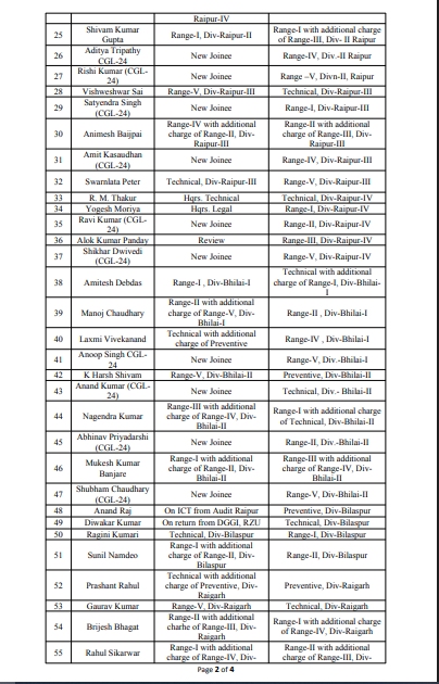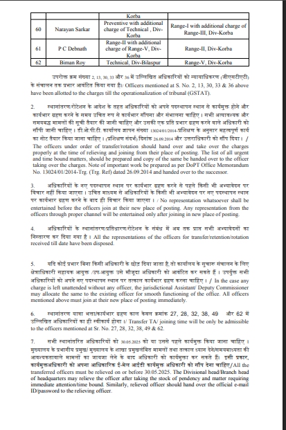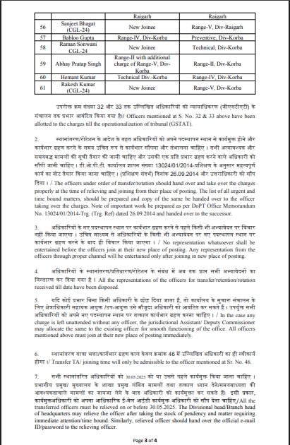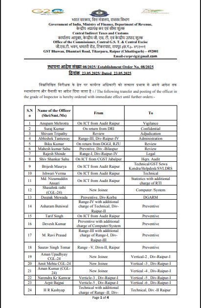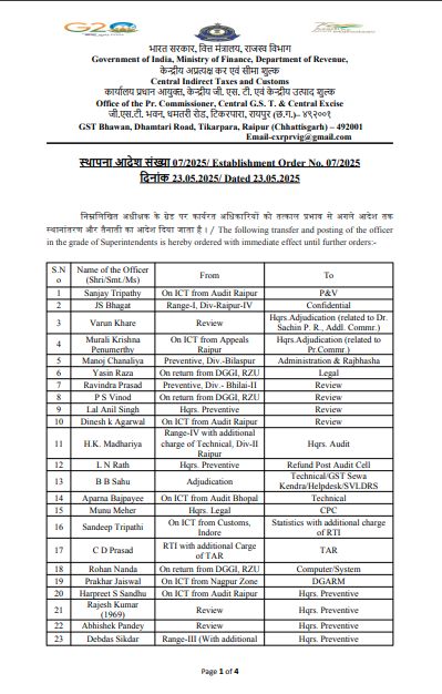 CGST Transfer News : रायपुर। केंद्रीय वस्तु एवं सेवा कर (CGST) एवं केंद्रीय उत्पाद शुल्क, रायपुर कार्यालय में बड़ा प्रशासनिक फेरबदल हुआ है। सीजीएसटी विभाग ने दो अहम तबादला आदेश जारी किए हैं, जिनमें सुपरिटेंडेंट और इंस्पेक्टर की नई पोस्टिंग की गई है। यह आदेश तत्काल प्रभाव से लागू होंगे और अगले आदेश तक प्रभावी रहेंगे।