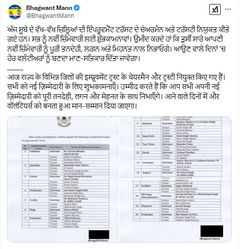सीएम मान ने लिस्ट जारी होने के साथ सभी को बधाई दी। उन्होंने ट्वीट शेयर कर लिखा, ”आज राज्य के विभिन्न जिलों की इम्प्रूवमेंट ट्रस्ट के चेयरमैन और ट्रस्टी नियुक्त किए गए हैं। सभी को नई ज़िम्मेदारी के लिए शुभकामनाएँ। उम्मीद करते हैं कि आप सभी अपनी नई ज़िम्मेदारी को पूरी तनदेही, लगन और मेहनत के साथ निभाएँगे। आने वाले दिनों में और वॉलंटियर्स को बनता हुआ मान-सम्मान दिया जाएगा।”