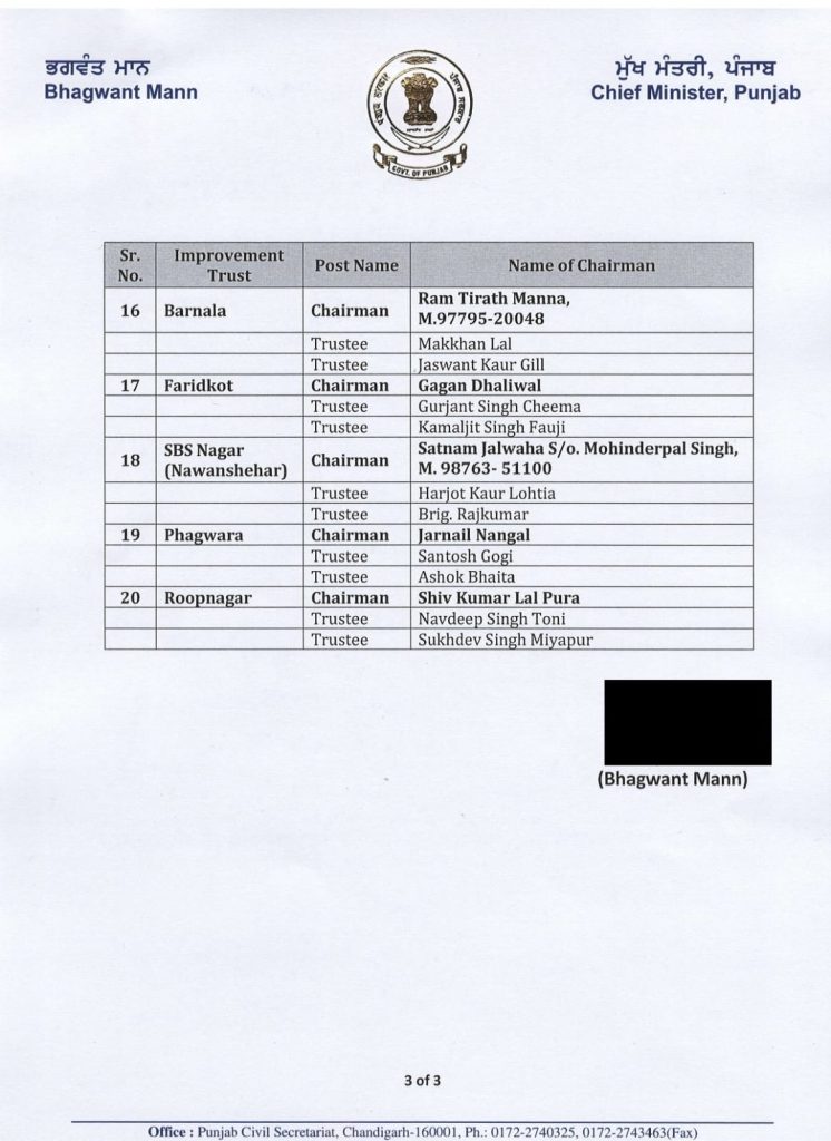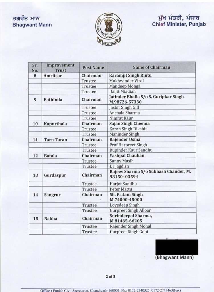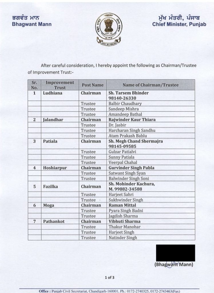 पंजाब मुख्यमंत्री भगवंत मान के आदेशों पर पंजाब के विभिन्न जिलों की इम्प्रूवमेंट ट्रस्ट के चेयरमैन और ट्रस्टी नियुक्त किए गए हैं। इन सभी की नियुक्ति और नाम की लिस्ट जारी कर दी गई है।