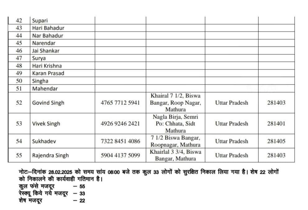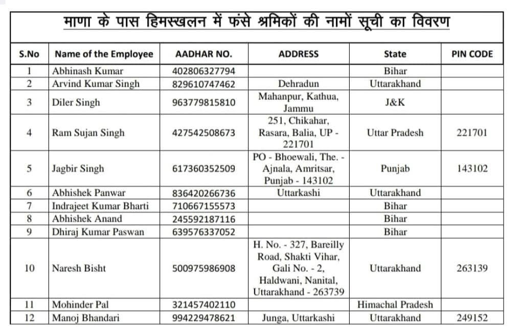 चमोली। उत्तराखंड की चमोली पुलिस ने 28 फरवरी को माना में हुए हिमस्खलन ( Chamoli Avalanche ) में फंसे 55 श्रमिकों के नामों की सूची जारी की। राज्य आपदा प्रबंधन सचिव विनोद कुमार सुमन ने कहा कि वहां पर मौसम लगातार खराब चल रहा है। मुख्यमंत्री लगातार स्थिति पर नजर रख रहे हैं। मुख्यमंत्री ने कल दो बार कंट्रोल रूम का भ्रमण किया । उन्होंने हर चीज पर विस्तृत जानकारी ली। बचाव और राहत कार्य तेजी से चल रहे हैं। कल तक 55 में से 47 लोगों को बचा लिया गया है। शेष 8 लोगों के लिए बचाव और राहत कार्य चल रहा है।