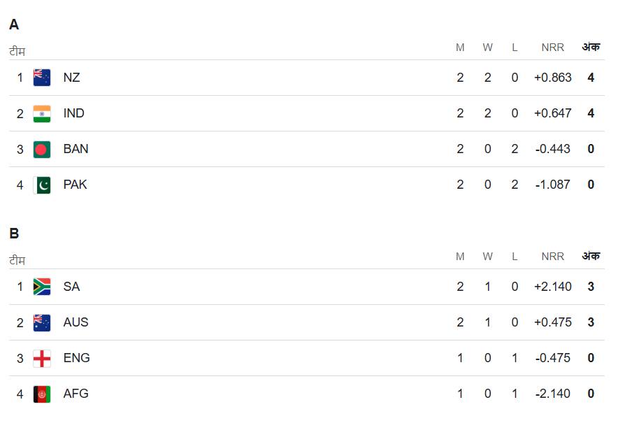 ग्रुप ए की बात करें तो उससे भारत और न्यूजीलैंड पहले ही सेमीफाइनल में जगह पक्की कर चुके हैं। दोनों टीमों के अभी चार-चार अंक हैं, दूसरी ओर पाकिस्तान और बांग्लादेश दो-दो मैच हार कर टूर्नामेंट से बाहर हो चुके हैं। अभी ग्रुप ए में 2 मैच खेले जाने बाकी हैं।