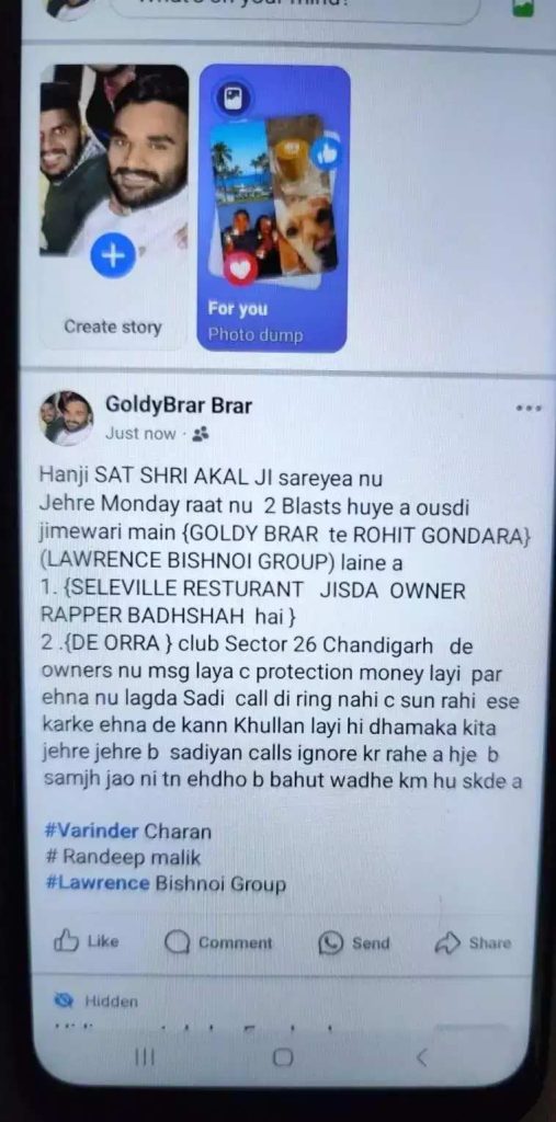 गोल्डी बराड़ ने धमाकों की जिम्मेदारी लेते हुए सोशल मीडिया पोस्ट में लिखा, ‘2 ब्लास्ट की जिम्मेदारी लॉरेंस गैंग के गोल्डी बराड़ और रोहित गोदारा लेते हैं. इन दोनों क्लबों के मालिकों को प्रोटेक्शन मनी के लिए मैसेज किया था. मगर इन्हें हमारी कॉल की घंटी नहीं सुनाई दे रही थी. इनके कान खोलने के लिए यह धमाके किए. जो भी हमारे कॉल्स को इग्नोर कर रहे हैं, वह समझ जाएं कि इससे भी कुछ बड़ा हो सकता है.’