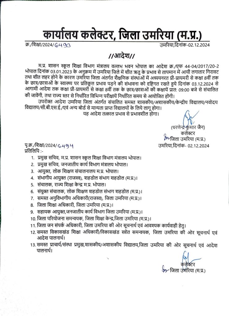दिसंबर का महीना आते ही लगातार दिन और रात के तापमान में गिरावट देखी जा रही है। मौसम विभाग के अलर्ट के बाद अब उमरिया कलेक्टर धरणेन्द्रा कुमार जैन ने जिले के स्कूल की टाइमिंग में बदलाव के आदेश दिए है। आगामी आदेश तक अब प्री प्रायमरी से लेकर कक्षा 8वीं तक के बच्चों के स्कूल का समय सुबह 9:00 बजे से संचालित होगा।