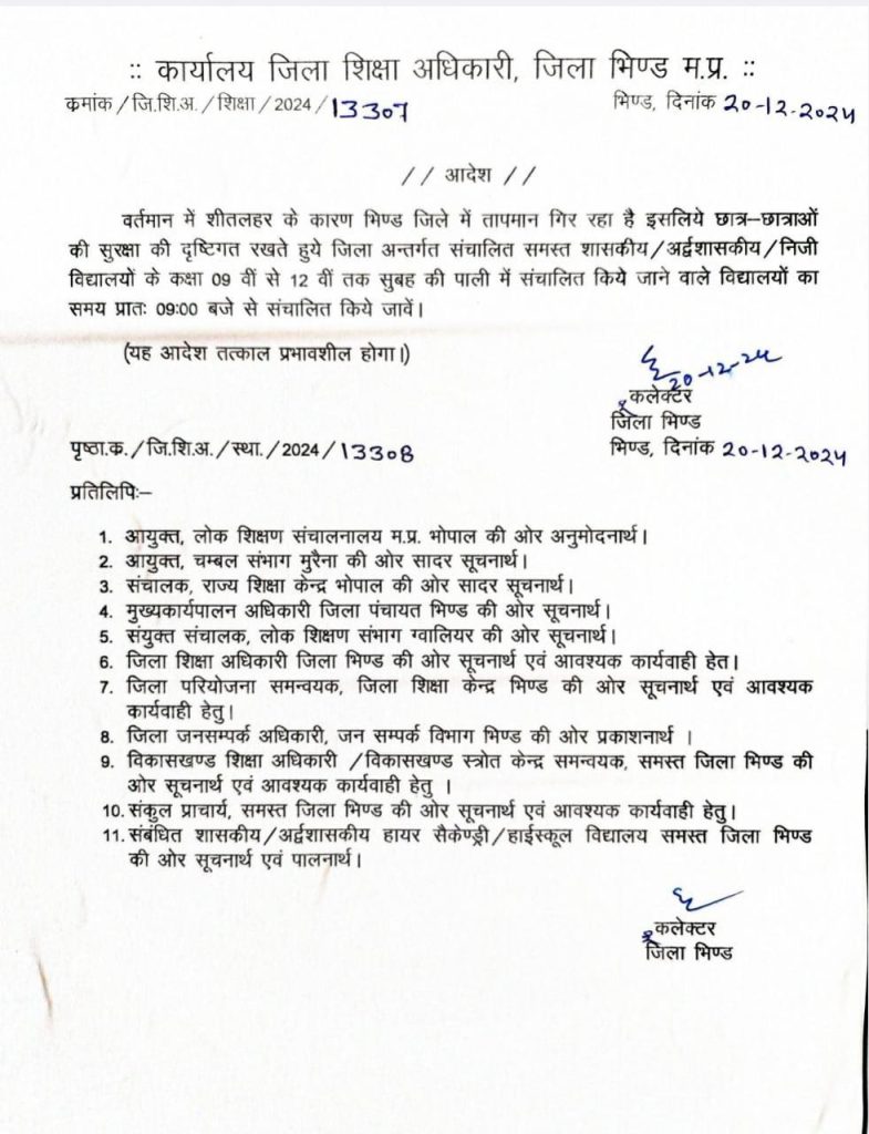 भिंड कलेक्टर ने जिले में शीतलहर को देखते हुए स्कूलों के समय में बदलाव किया है। केजी से लेकर 12वीं तक के विद्यालयों की टाइमिंग बदल दी है। दरअसल जिले में लगातार तापमान गिरने से ठंड का कहर देखने को मिल रहा है। छात्र-छात्राओं की सुरक्षा को देखते हुए यह फैसला लिया गया है।