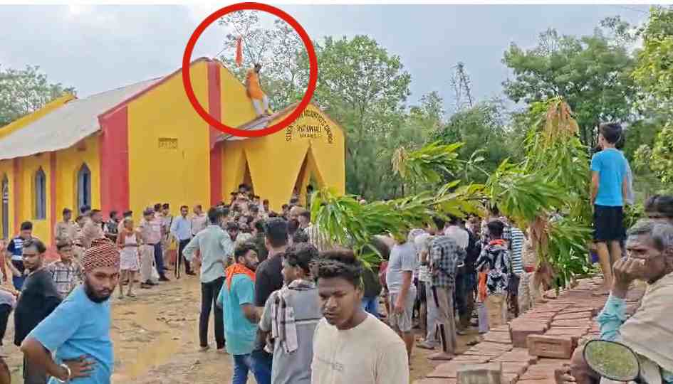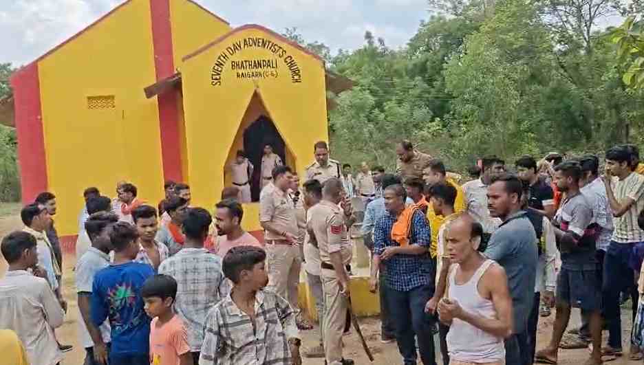 नरेश शर्मा, रायगढ़. छत्तीसगढ़ के रायगढ़ जिले के ग्राम भाठनपाली में चर्च में सभा लगाने वालों ने हनुमान मंदिर तोड़ दिया. इस घटना के बाद ग्रामीणों में भारी आक्रोश है. गांव में तनाव का माहौल है. बजरंग दल ने भी गांव पहुंचकर जमकर हंगामा मचाया. आक्रोशित लोगों ने चर्च पर चढ़कर भगवा झंडा फहराया. मंदिर तोड़ने से गुस्साए लोगों ने हाथ में गैंती, फावड़ा लेकर चर्च तोड़ने का भी प्रयास किया, जिसे पुलिसकर्मियों ने कड़ी मशक्कत के बाद रोका.