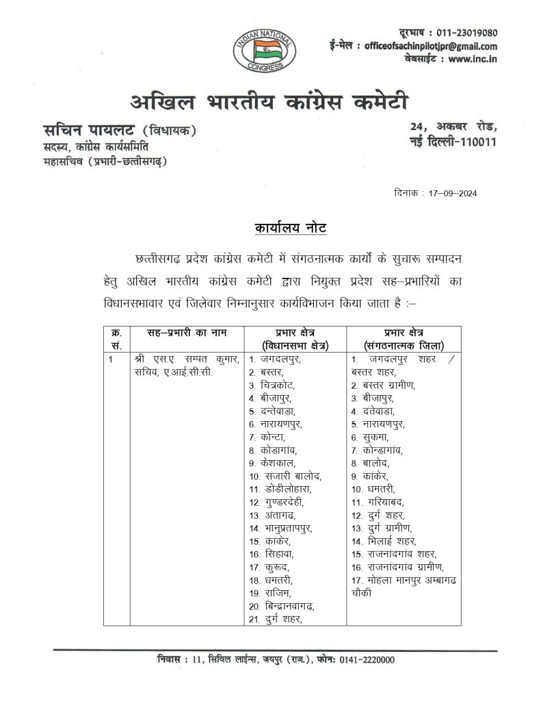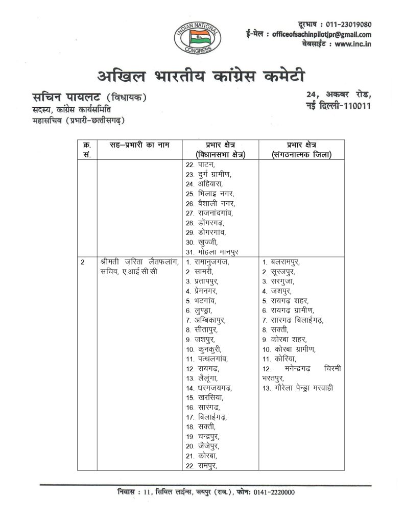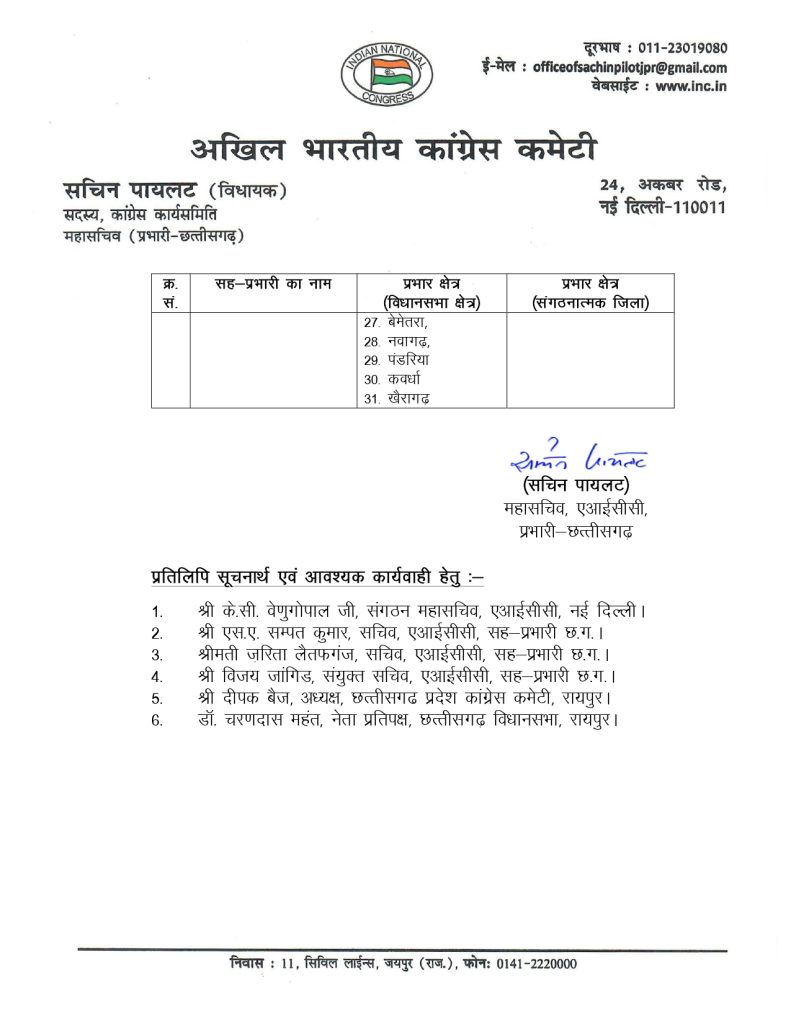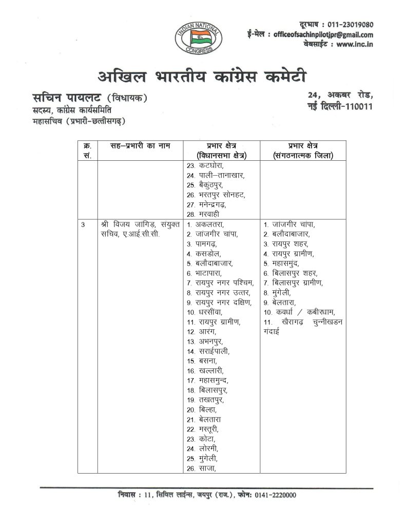 रायपुर। प्रदेश कांग्रेस ने प्रभारी सचिवों को प्रभार सौंपा है। कांग्रेस प्रदेश प्रभारी सचिन पायलट ने प्रभारी सचिवों को विधानसभा क्षेत्रों जिम्मेदारी सौंपी है।
