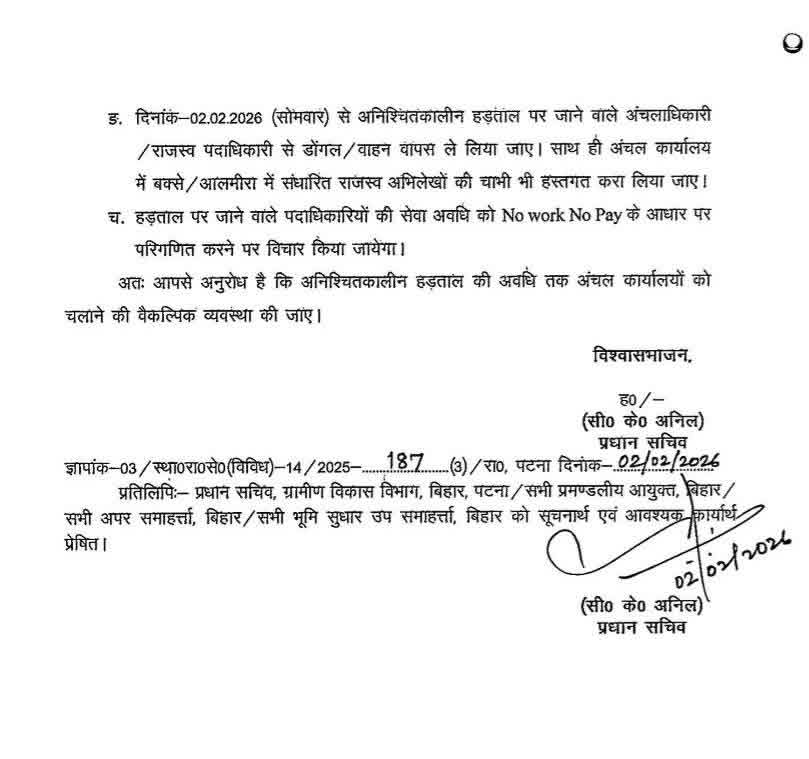 स्थिति को गंभीर देखते हुए, राजस्व एवं भूमि सुधार विभाग ने जिलाधिकारी को पत्र जारी किया। पत्र में निर्देश दिए गए हैं कि सभी अंचल अधिकारी राजस्व अधिकारी से सरकारी गाड़ी, डोंगल और आलमारी की चाभी लेकर कार्यालय संचालन सुनिश्चित करें।