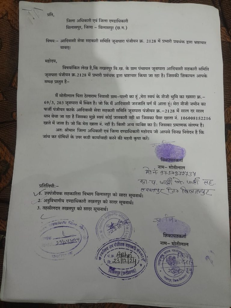 अभिषेक सेमर, तखतपुर। छत्तीसगढ़ के बिलासपुर जिले में आदिवासी किसान के साथ धोखाधड़ी का मामला सामने आया है, जहां किसान हितैशी सरकार के नुमाइंदे आदिवासी किसान को सालों से चुना लगा रहे हैं. किसान के पर्ची पर लाखों रुपये का धान बेचकर वे मलाई खा रहे थे और किसान को इसका पता भी नहीं था. इस मामले का खुलासा तब हुआ जब आदिवासी किसान धान बेचने के लिए टोकन कटाने इस साल धान खरीदी केंद्र पहुंचा, जहां उसे पता चला कि 5 से 6 सालों से उसके पर्ची से धान बेचा जा रहा था. जब इसकी जांच की गई तो पता चला कि उसके पर्ची से पिछले 5 सालों से धान की हेराफेरी की जा रही थी. इस गंभीर स्थिति को देखते हुए किसान ने कलेक्टर से अपनी फरियाद लगाई और दोषियों के खिलाफ कार्रवाई की मांग की है.