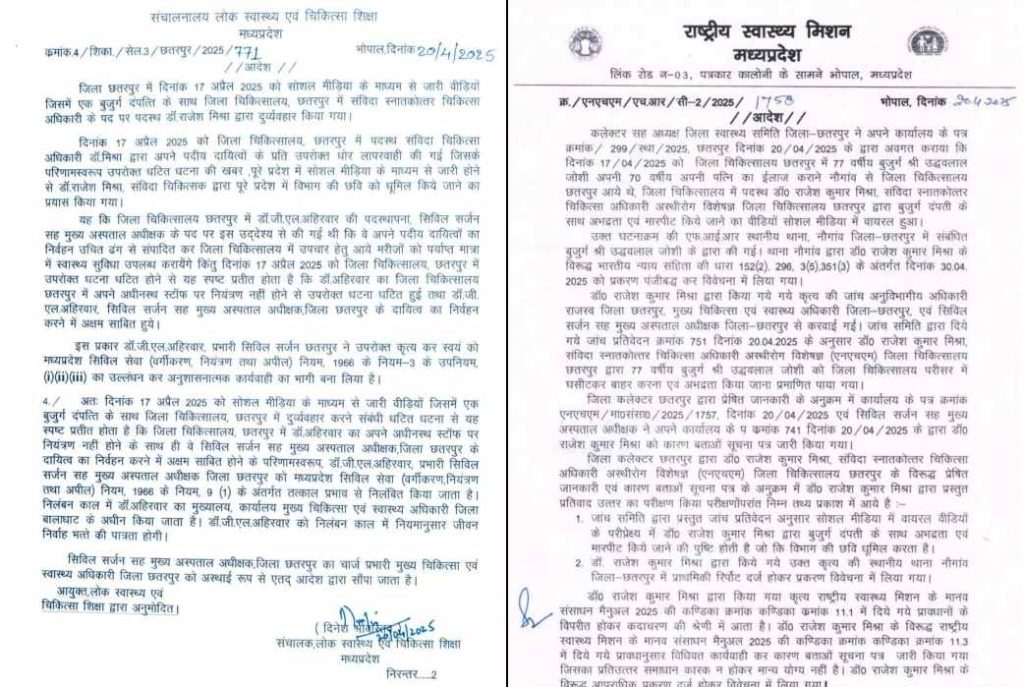 रणधीर परमार, छतरपुर। मध्य प्रदेश के छतरपुर में बुजुर्ग दंपति के साथ अमानवीय घटना पर बड़ा एक्शन लिया गया है। डॉक्टर राजेश मिश्रा और रेडक्रॉसकर्मी राघवेन्द्र खरे की सेवा समाप्त कर दी गई है। वहीं सिविल सर्जन जीएल अहिरवार को निलंबित कर दिया गया है।