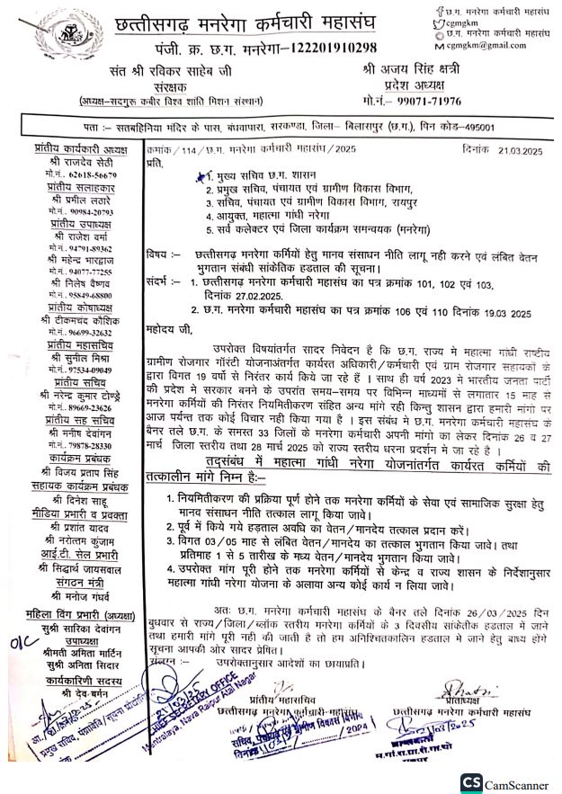 अब उम्र के पांचवें दशक में कदम रख चुके हजारों मनरेगा कर्मी अपने भविष्य की सुरक्षा के लिए संघर्ष कर रहे हैं। इसी कड़ी में 28 मार्च को प्रदेश भर के 12 हजार कर्मचारी रायपुर में एकत्रित होकर मुख्यमंत्री विष्णुदेव साय और उपमुख्यमंत्री एवं पंचायत मंत्री विजय शर्मा के नाम कलेक्टर को ज्ञापन सौंपेंगे।
