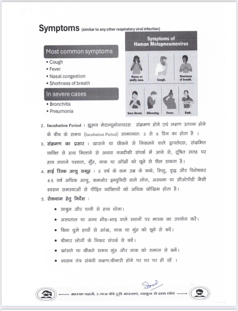 गौरतलब है कि एचएमपी वायरस खांसने, छींकने से निकलने वाले ड्रॉपलेट्स, संक्रमित व्यक्ति से हाथ मिलाने अथवा नजदीकी संपर्क में आने, दूषित सतह पर हाथ लगाने के बाद मुंह, नाक या आंखों को छूने से फैलता है। सर्दी, खांसी, बुखार तथा सर्दियों में सांस लेने में परेशानी इसके सामान्य लक्षण हैं। कुछ गंभीर मामलों में निमोनिया और ब्रोंकाइटिस भी इस बीमारी के लक्षण हैं। देश के कुछ राज्यों में इसके मरीज मिलने की सूचना मिलते ही राज्य के स्वास्थ्य विभाग का अमला अपनी तैयारी में जुट गया है। विशेषज्ञों के अनुसार यह एक सामान्य रेस्पिरेटरी वायरस है जो आम तौर पर सर्दी के दिनों में दिखाई पड़ता है।