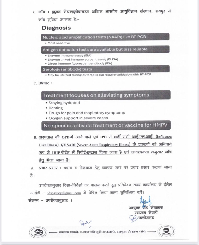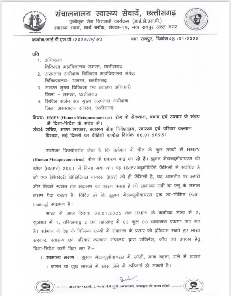सत्या राजपूत, रायपुर। कर्नाटक, गुजरात और महाराष्ट्र में ह्यूमन मेटान्यूमोवायरस (एचएमपीवी) की पुष्टि के बाद छत्तीसगढ़ भी अलर्ट हो गया है। विशेषज्ञों का कहना है कि एचएमपीवी वायरस पहले से मौजूद है, पर ज्यादा आक्रामक नहीं है। इसके बावजूद लोगों को सतर्क रहने की जरूरत है। इससे घबराने की जरूरत नहीं है, बल्कि सावधानी बरतनी है। वायरस को लेकर सतर्कता बरतने और तैयारियों के संबंध में स्वास्थ्य मंत्री श्याम बिहारी जायसवाल ने आज मंत्रालय नवा रायपुर में स्वास्थ्य विभाग के वरिष्ठ अधिकारियों की बैठक ली और आवश्यक दिशा-निर्देश दिए हैं। वहीं, इस वायरस से बचाव को लेकर गाइडलाइन भी जारी कर दी गई है।