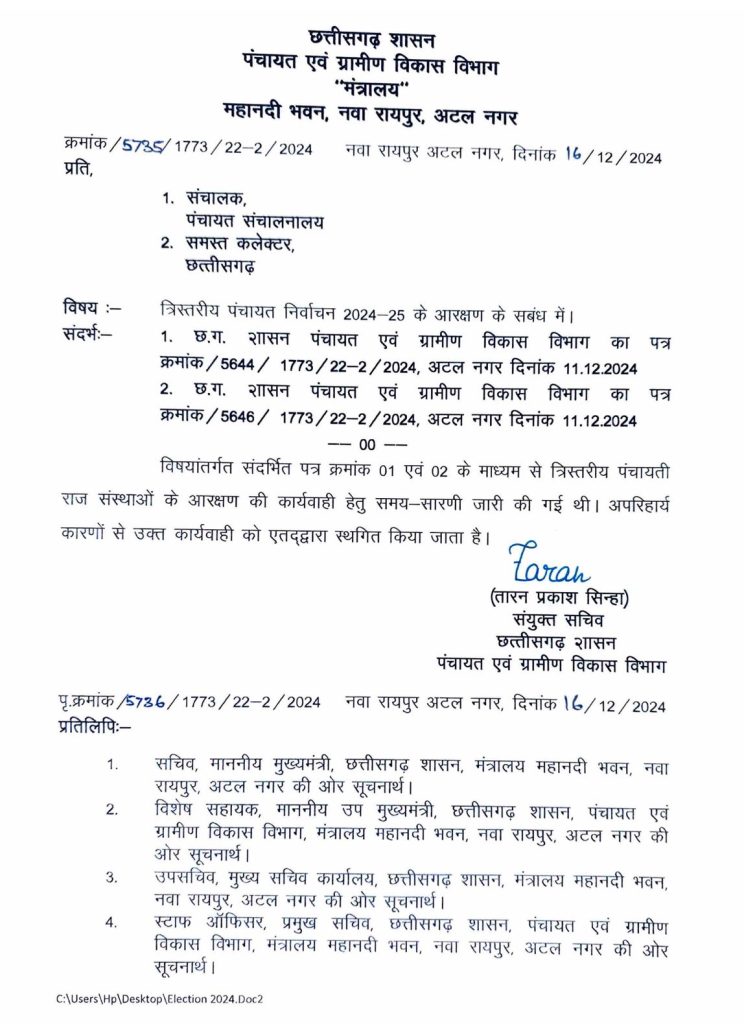 रायपुर। छत्तीसगढ़ सरकार के पंचायत एवं ग्रामीण विकास विभाग ने आगामी त्रिस्तरीय पंचायत चुनाव 2024-25 के लिए आरक्षण की प्रक्रिया को स्थगित कर दिया है. विभाग ने यह निर्णय अपरिहार्य कारणों का हवाला देते हुए लिया है. यह आदेश संयुक्त सचिव तारन प्रकाश सिन्हा ने जारी किया है.