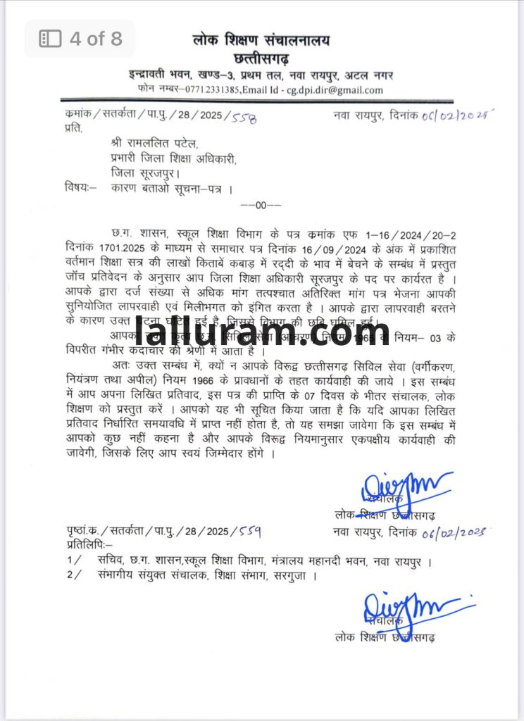 जारी नोटिस के मुताबिक, लोक शिक्षण संचालनालय ने सूरजपुर डीईओ राम ललित पटेल, राजनांदगांव तत्कालीन प्रभारी डीईओ अभय कुमार जायसवाल, जशपुर डीईओ प्रमोद कुमार भटनागर, राजनांदगांव तत्कालीन प्रभारी डीईओ आदित्य खरे( वर्तमान सहायक संचालक डीईओ कार्यालय राजनांदगांव) , धमतरी डीईओ टीआर जगदल्ले, सरोज खलखो सहायक संचालक कार्यालय जशपुर और अन्य जिला शिक्षा अधिकारी कार्यालय के कर्मचारियों को नोटिस जारी हुआ है. इन सभी को नोटिस में कहा गया है सात दिन के अंदर जवाब नहीं देने पर एकतरफ़ा कार्रवाई की जाएगी.