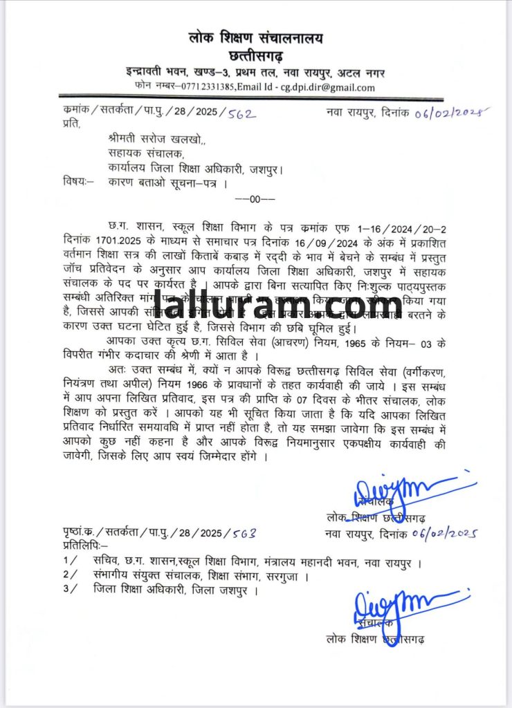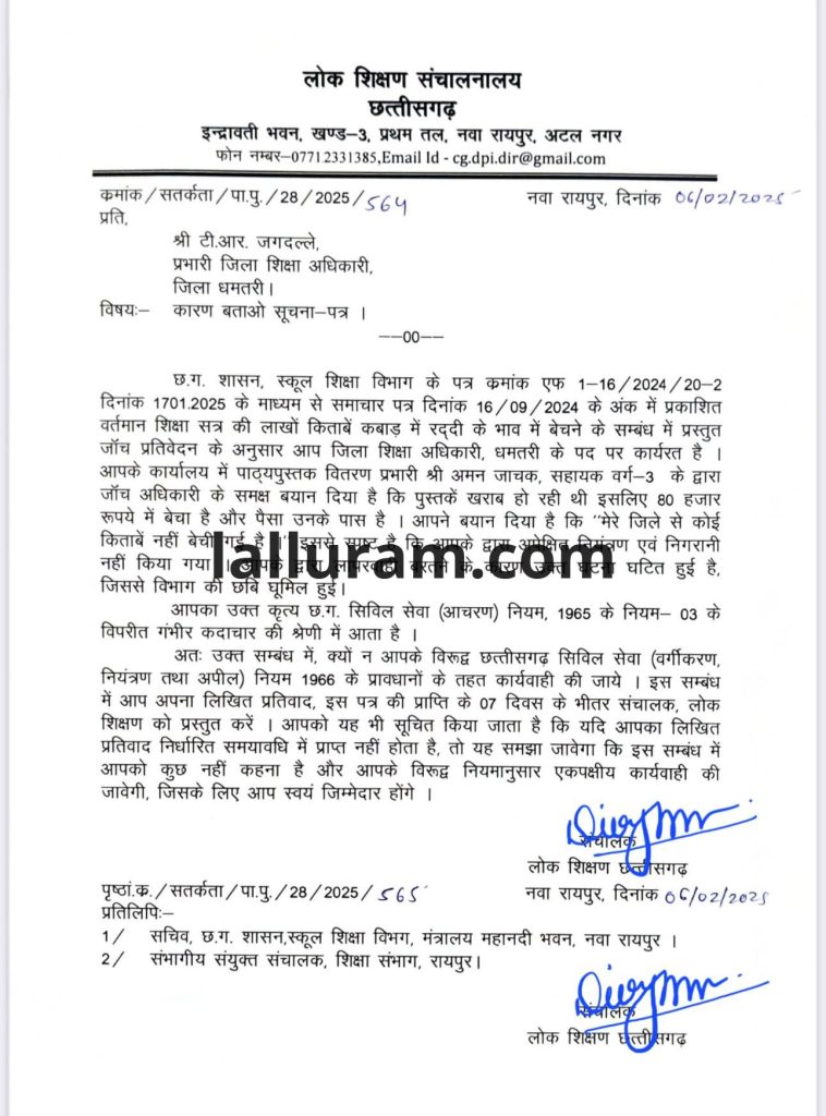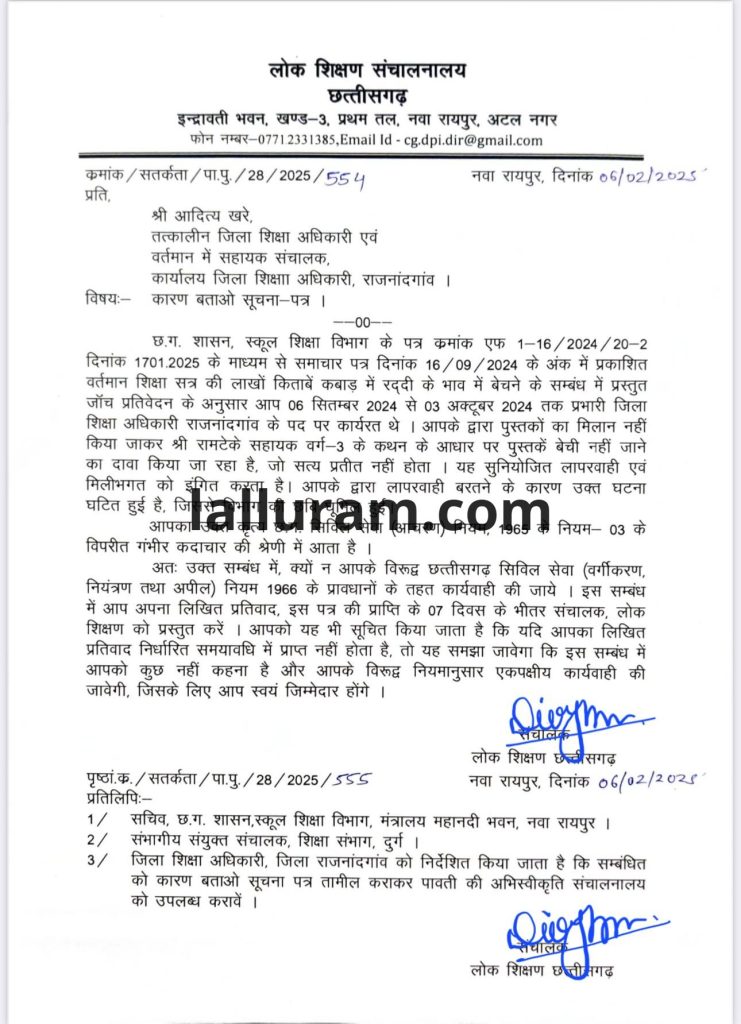 सत्या राजपूत, रायपुर। छत्तीसगढ़ में पुस्तक घोटाला मामले की जांच पूरी होने के बाद अब लोक शिक्षण संचालनालय (DPI) एक्शन के मूड में है. घोटाले की जांच रिपोर्ट में संलिप्त पाए गए राजनांदगांव, सूरजपुर, धमतरी, जशपुर के जिले के शिक्षा अधिकारी और कर्मचारियों को कारण बताओ नोटिस जारी किया गया है. साथ ही सभी से 7 दिन के भीतर जवाब मांगा है.