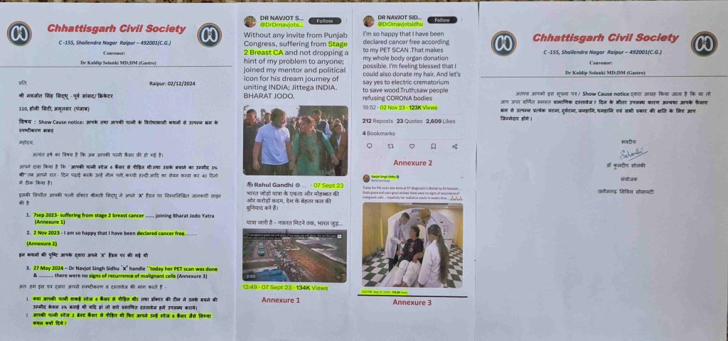 नोटिस में लिखा है कि STAGE 2 Breast Cancer को स्टेज 4 क्यों बता रहे हैं. नवंबर 2023 में डॉ. सिद्धू कैंसर फ्री हो गई थी तो नवजोत सिद्धू नवंबर 2024 में ठीक होने का दावा क्यों कर रहे हैं. छत्तीसगढ़ सिविल सोसाइटी ने कहा है कि नवजोत सिंह झूठ बोलना और मरीजों की जान से खिलवाड़ करना बंद करें. 7 दिनों के भीतर इलाज के प्रमाणित डॉक्यूमेंट पेश करें अन्यथा कानूनी कार्रवाई की जाएगी. बता दें कि इससे पहले भी सोसाइटी ने सिद्धू दम्पत्ति को लीगल नोटिस जारी किया था और 7 दिन के भीतर नवजोत सिंह सिद्धू की पत्नी नवजोत कौर सिद्धू के स्वास्थ्य दस्तावेज मंगाए गए हैं, जिससे उनके (नवजोत सिंह सिद्धू) की तरफ से किए गए दावों को वे साबित कर सकें. ऐसा नहीं करने पर उन पर 850 करोड़ की क्षतिपूर्ति का दावा करने की चेतावनी दी है.