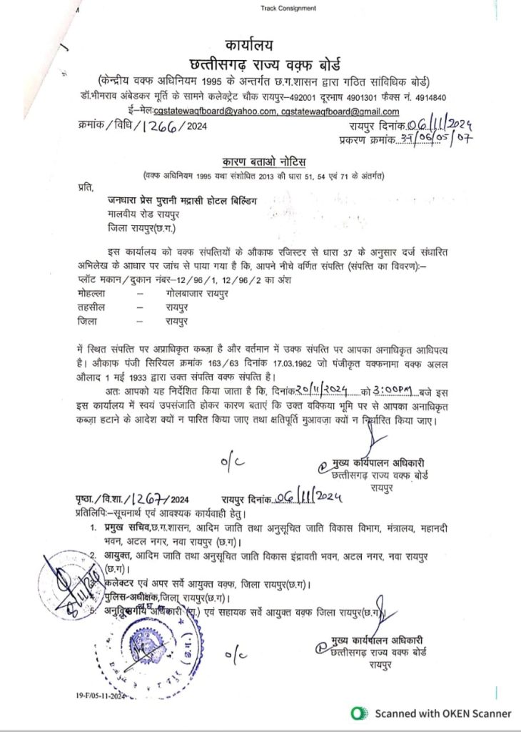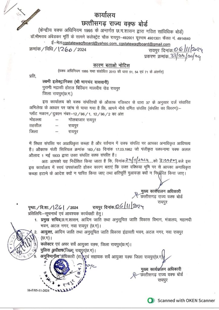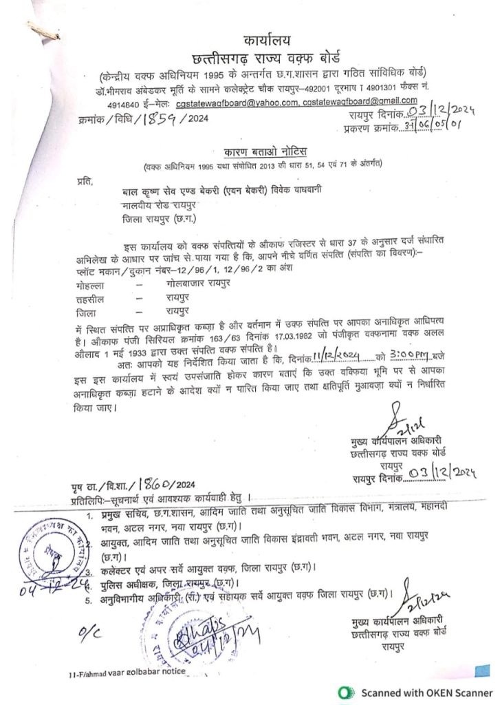 बता दें कि रायपुर में फर्जी तरीके से रजिस्ट्री की गई संपत्तियों में लक्ष्मी इलेक्ट्रिकल्स, ए-टू-जेड बेकरी, पगारिया ज्वेलर्स समेत 14 से अधिक प्रतिष्ठानों के नाम सामने आए हैं। वक्फ बोर्ड ने 400 से अधिक लोगों को नोटिस जारी किए हैं।