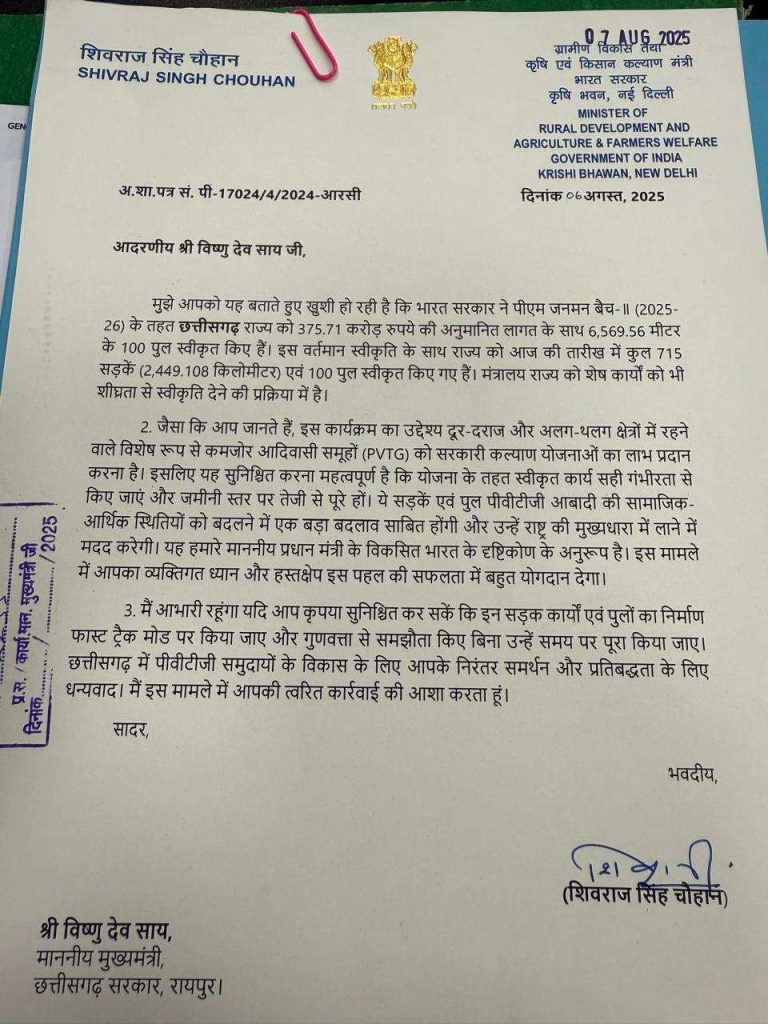 रायपुर। छत्तीसगढ़ के विकास कार्यों को गति देने के लिए केंद्र सरकार ने एक और बड़ी पहल की है। केंद्रीय ग्रामीण विकास एवं कृषि मंत्री शिवराज सिंह चौहान ने मुख्यमंत्री विष्णुदेव साय को पत्र भेजकर सूचित किया है कि राज्य को प्रधानमंत्री जनमन योजना (बैच-II, वर्ष 2025–26) के तहत 100 नए पुलों की मंजूरी दी गई है। इन पुलों की कुल अनुमानित लागत 375.71 करोड़ रुपये होगी और इनकी कुल लंबाई 6,569.56 मीटर होगी।